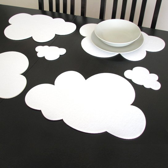 Zestaw czterech podkładek pod talerze, wyciętych laserowo w białym filcu. Pięknie wyglądają na stole, są duże, wyraziste, oryginalne, z filcu najwyższej jakości. Do kompletu podkładek dołączone są dwie małe chmurki gratis, złączone razem mogą służyć jako podstawka pod naczynie żaroodporne. Grubość filcu 4mm,