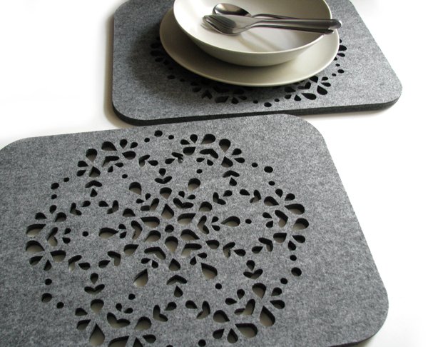 Zestaw czterech podkładek pod talerz wycięte laserowo w szarym filcu. Prostokątne, na środku wycięty wzór zainspirowany tradycyjna serwetką. Oryginalne, stanowią uroczy dodatek dla wnętrza.
