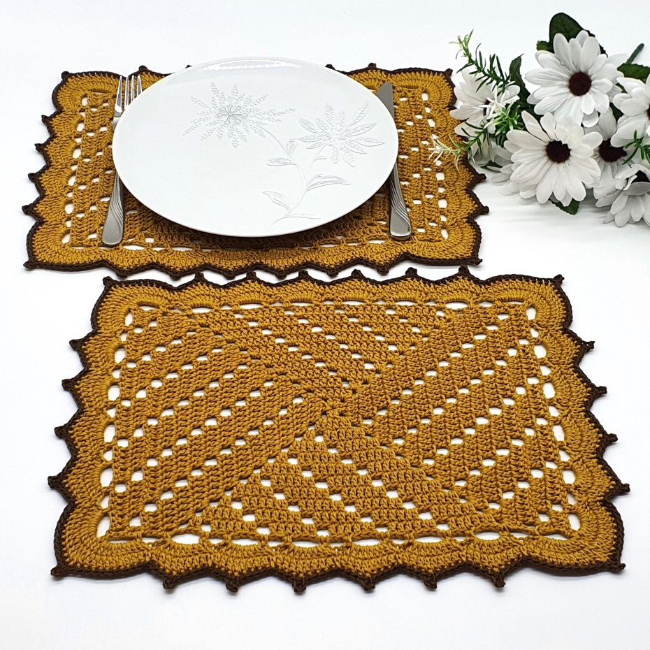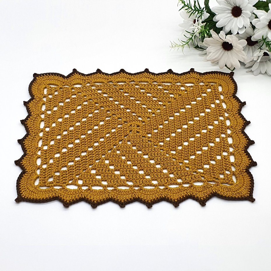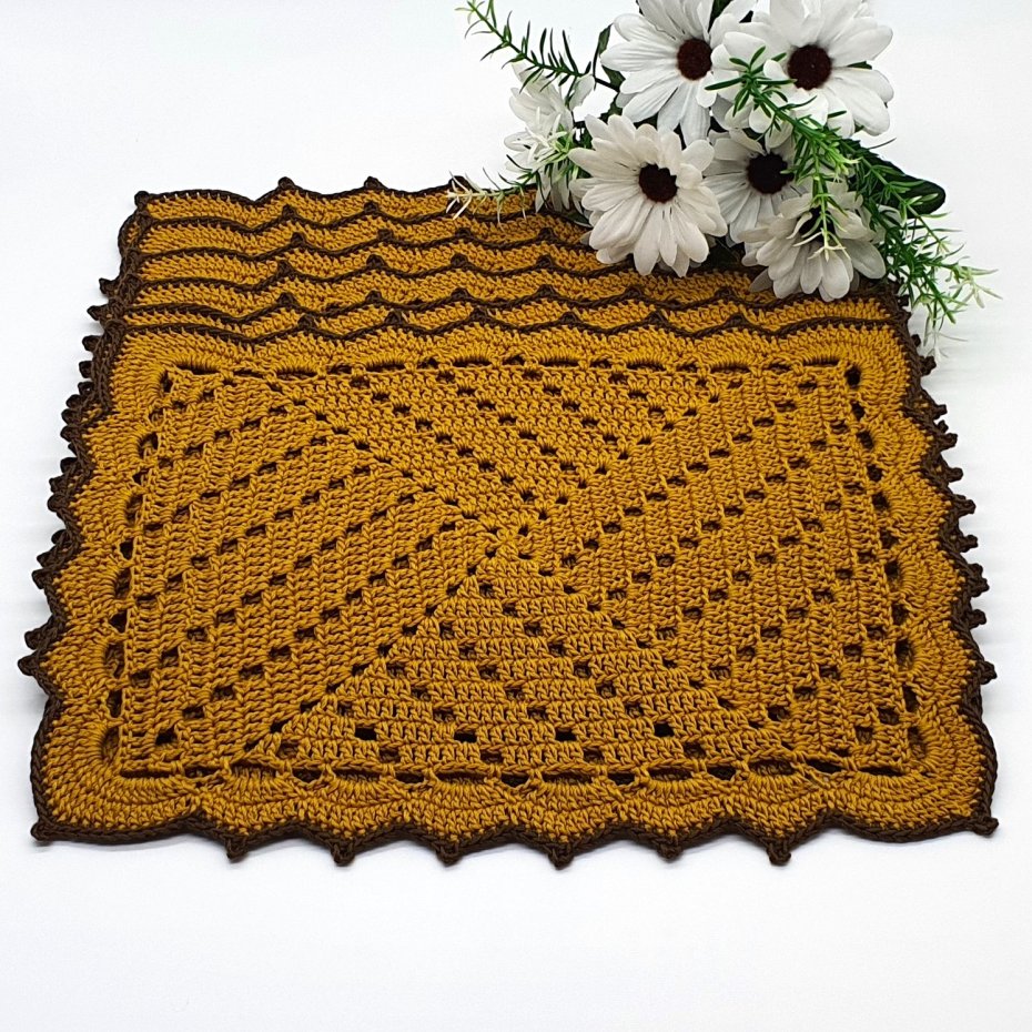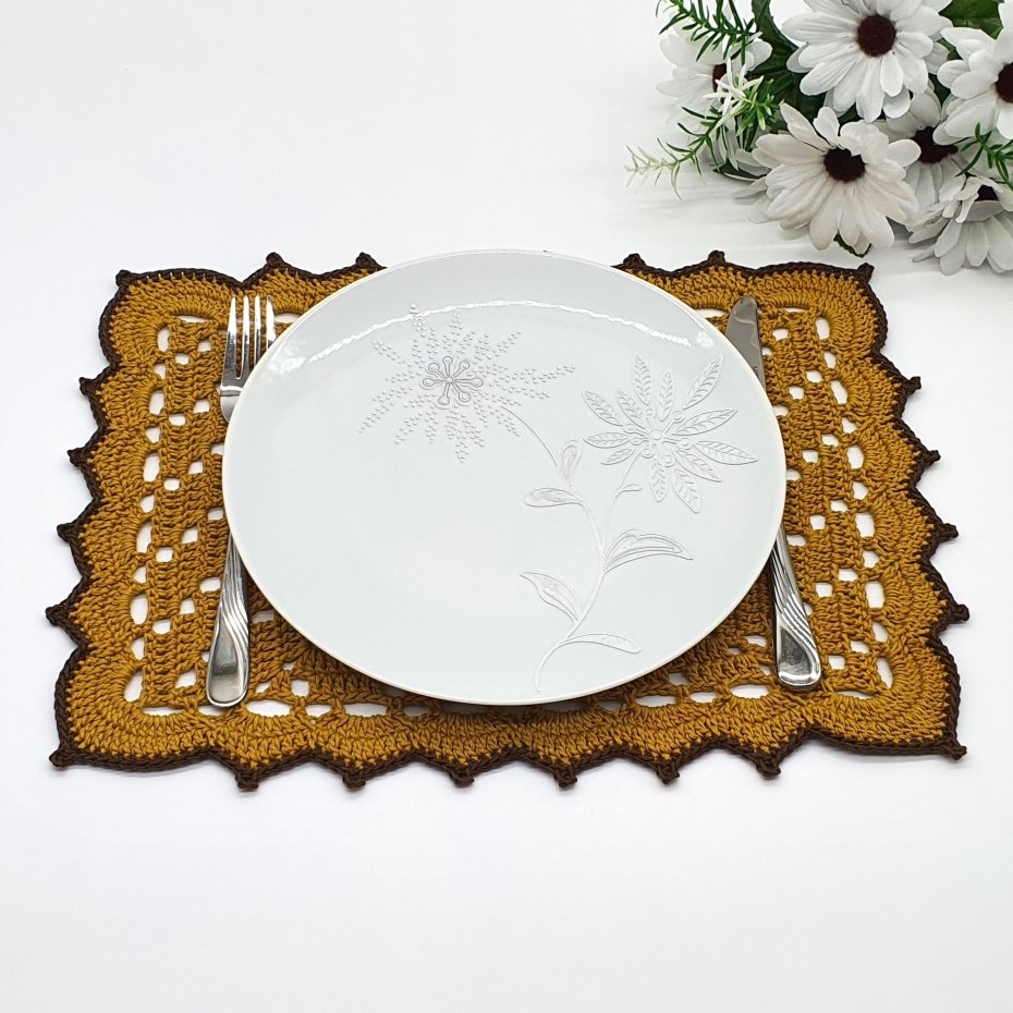 Komplet 6 prostokątnych podkładek pod talerz w kolorze musztardowym, z brązową lamówką, wykonany został na szydełku, z grubego kordonka, 37 cm x 27 cm.