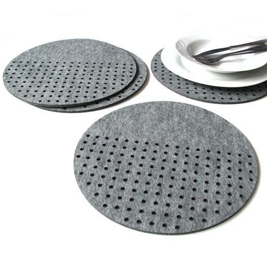 Zestaw czterech okrągłych podkładek pod talerze, wyciętych laserowo w szarym filcu grubości 4mm. Podkładki proste, gładkie, udekorowane równomiernie ułożonymi ażurowymi kropeczkami. Pęknie komponują się z nowoczesnymi wnętrzami. Podkładki można dodatkowo udekorować dowolną przeplatanką.