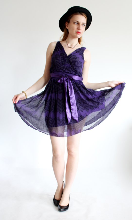 Zwiewna, dwuwarstwowa sukienka wiązana w talii. Na boku zapięcie na suwak.