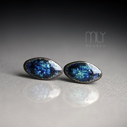 Efektowne kolczyki w formie sztyftów, ręcznie wykonane z delikatnej czekoladowobrązowej gliny kamionkowej, jednostronnie szkliwione efektownym błękitnym szkliwem, na antyalergicznych sztyftach w kolorze srebrnym.długość elementu ceramicznego ok. 14mm, Polecam