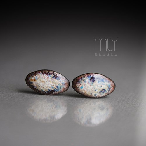 Efektowne kolczyki w formie sztyftów, ręcznie wykonane z delikatnej czekoladowobrązowej gliny kamionkowej, jednostronnie szkliwione efektownym kremowo różowym i brunatnym szkliwem, na antyalergicznych sztyftach w kolorze srebrnym.długość elementu ceramicznego ok. 14mm, Polecam