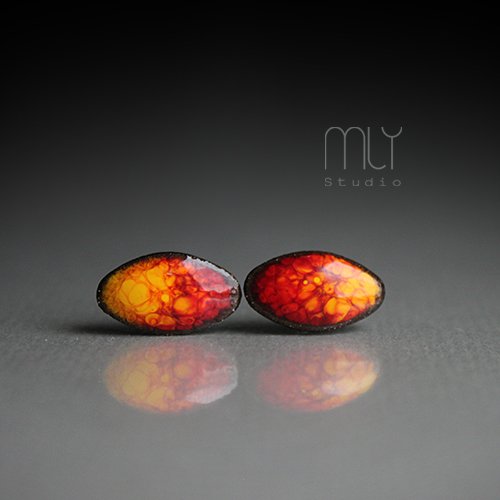 Efektowne kolczyki w formie sztyftów, ręcznie wykonane z delikatnej czekoladowobrązowej gliny kamionkowej, jednostronnie szkliwione efektownym czerwono żółtym szkliwem, na antyalergicznych sztyftach w kolorze srebrnym.długość elementu ceramicznego ok. 14mm, Polecam