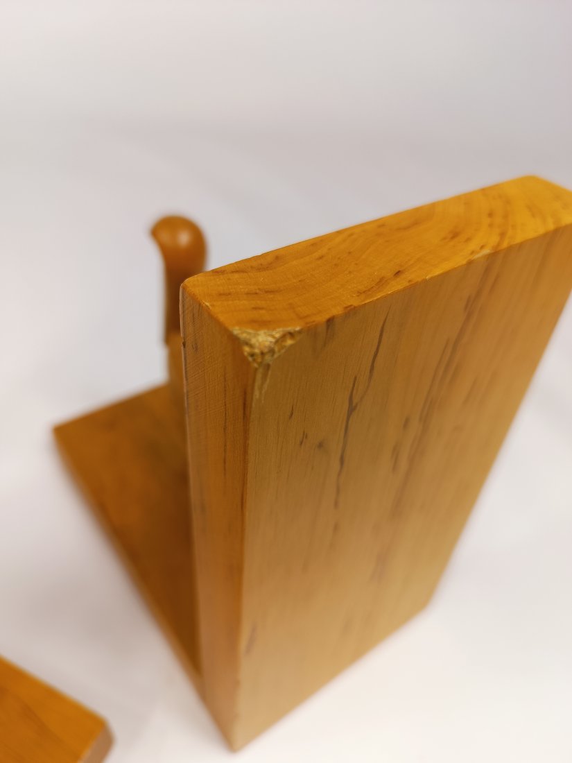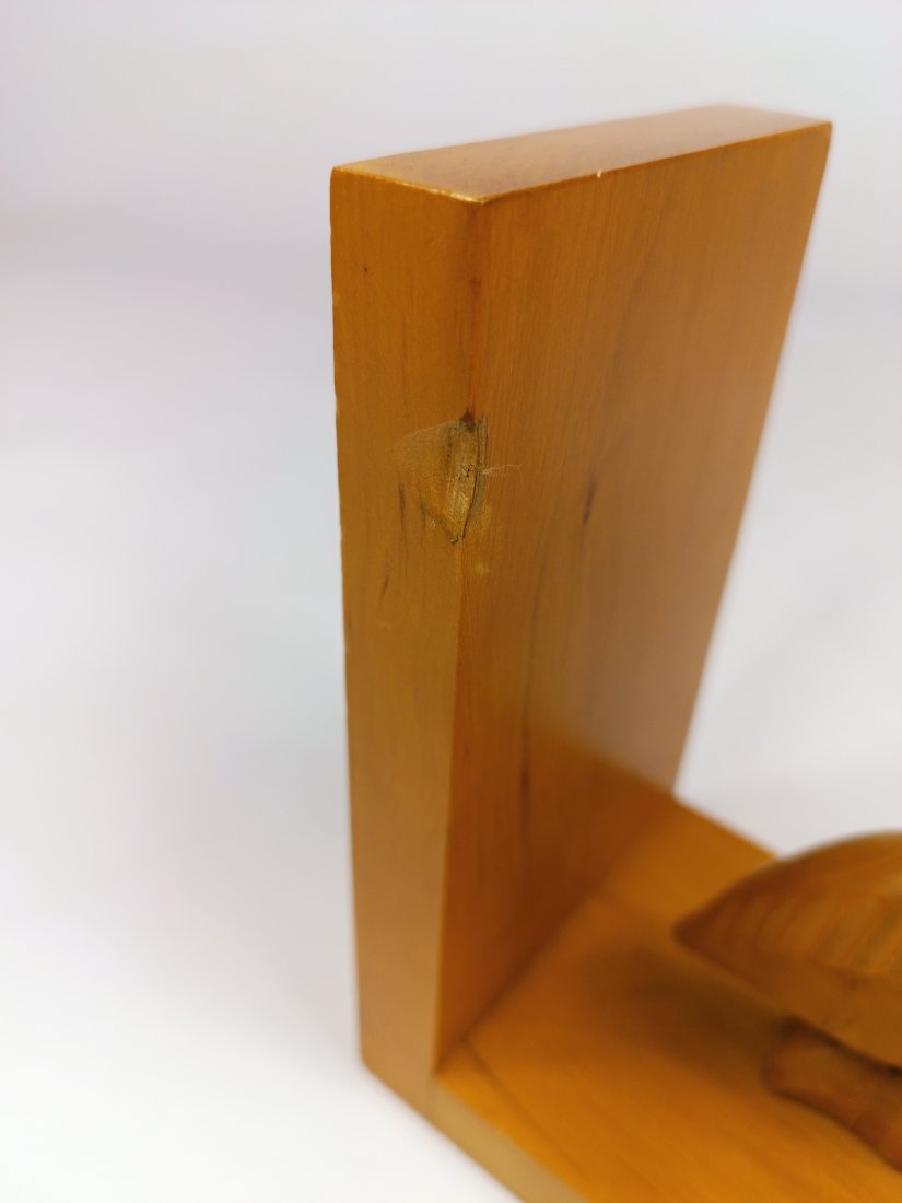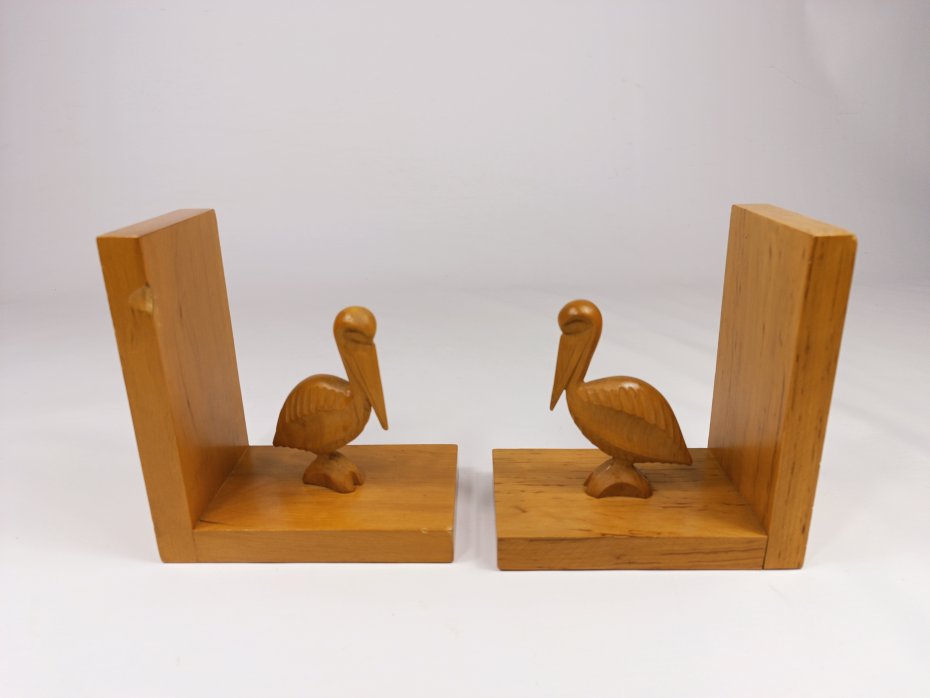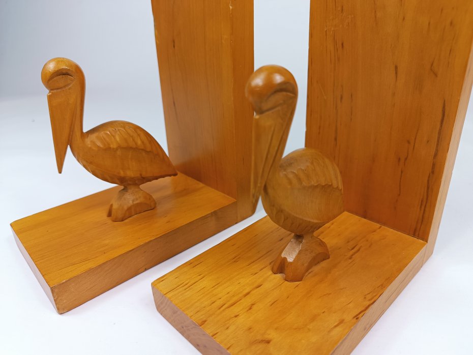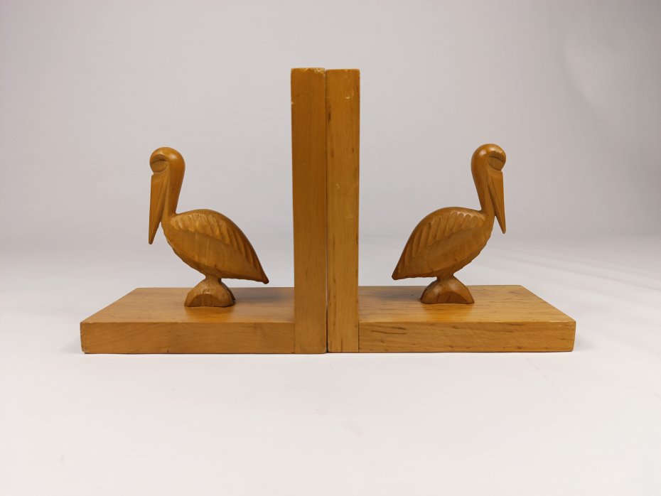 Drewniane podpórki do książek w kształcie pelikanów z lat 70. Na podpórkach widoczne są ślady użytkowania, zadrapania, przetarcia oraz jedno większe obicie. Szerokość 15 cm, wysokość 16 cm.