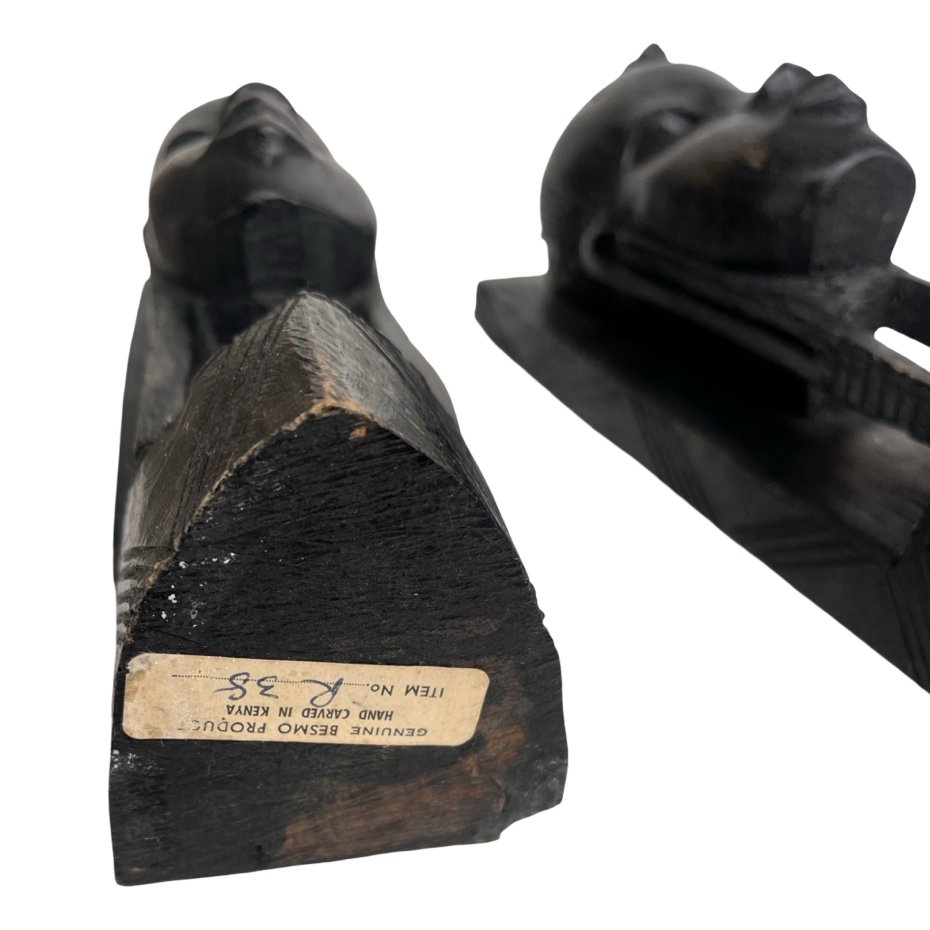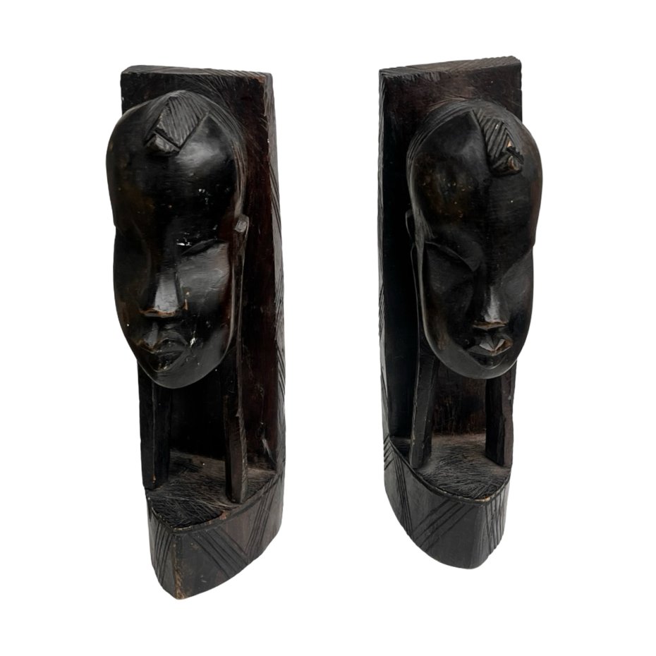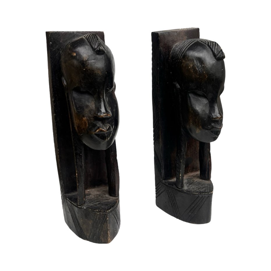 Ręcznie rzeźbione podpórki pod książki z ciemnego hebanu, wykonane w Kenii. Przedstawiają stylizowane popiersia o klasycznych, afrykańskich rysach i geometrycznym zdobieniu. Każdy egzemplarz to unikat, noszący ślady indywidualnej pracy rzeźbiarza.