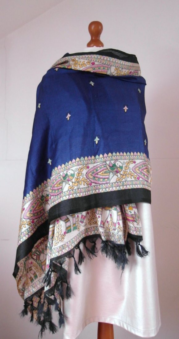 Ozdobny,duży szal w pięknym kolorze - niebieski "royal blue". Dosyć cienki, miękki,z lekkim połyskiem. Oby nie przyćmił kreacji ;-)