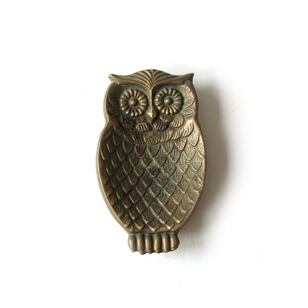 Uroczy maleńki podstawek na torebkę od herbaty. Okrągły, w kształcie sowy, oryginalny dodatek do wnętrza, wykonany z mosiądzu.
