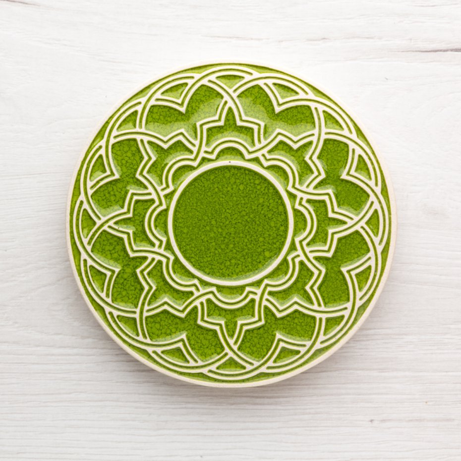 Ceramiczna podstawka talerzyk pod kubek, filiżankę, świece itp. z geometrycznym, lekko wypukłym ornamentem. Wykonana z jasnej gliny. Górna powierzchnia pokryta błyszczącym, jasnozielonym szkliwem.