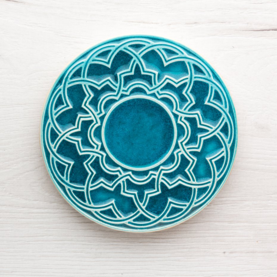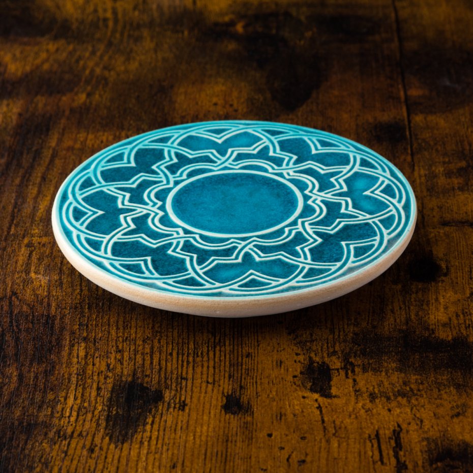 Ceramiczna podstawka talerzyk pod kubek, filiżankę, świece itp. z geometrycznym, lekko wypukłym ornamentem. Wykonana z jasnej gliny. Górna powierzchnia pokryta błyszczącym, turkusowym szkliwem.