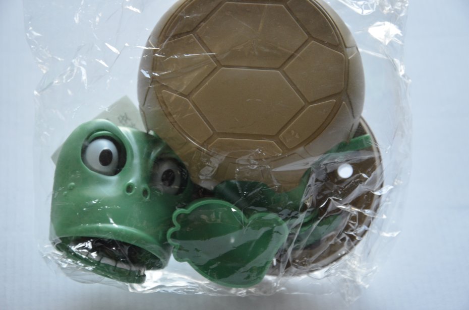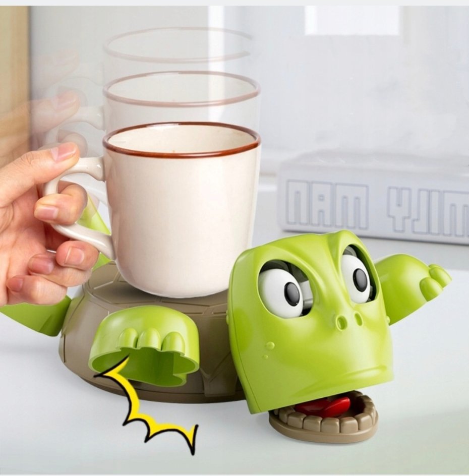 zabawny gadżet - podstawka pod kubek w kształcie żółwia; wykonana z plastiku;