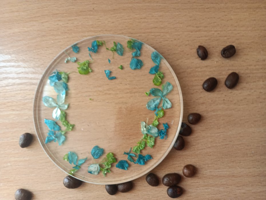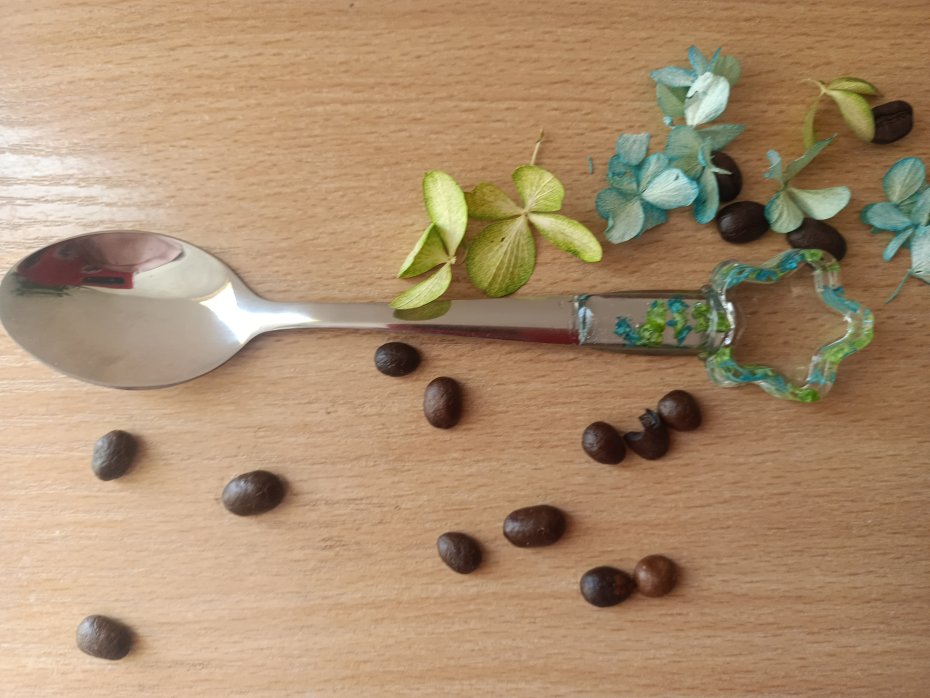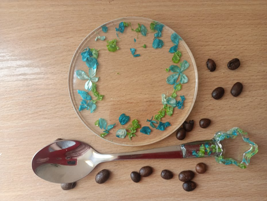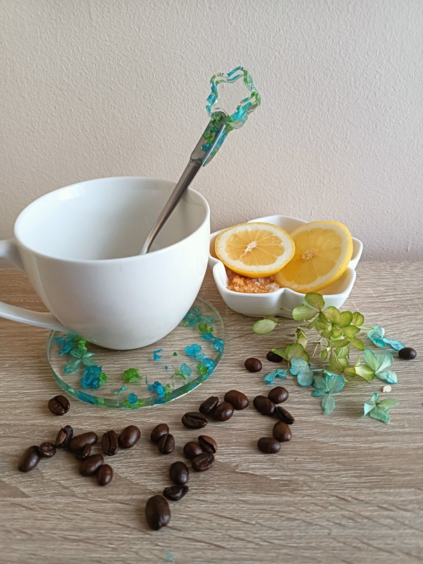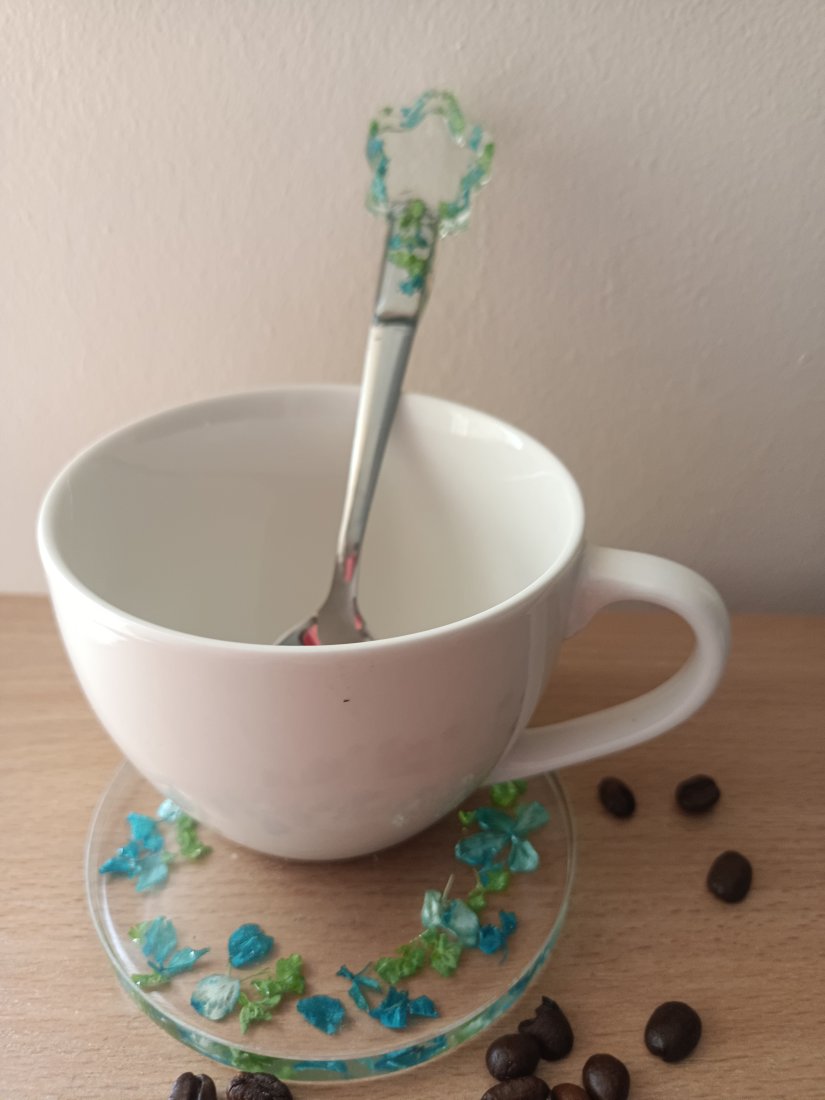 Piękna podstawka z żywicy epoksydowej, ozdobiona prawdziwymi, suszonymi kwiatami w komplecie z ozdobną łyżeczką i filiżanką. Każdy egzemplarz jest unikatowy, ponieważ kwiaty układają się w niepowtarzalny wzór. Podstawka i łyżeczka stanowią elegancki element nakrycia stołu i pasuja także do Twojego ulubionego kubka.