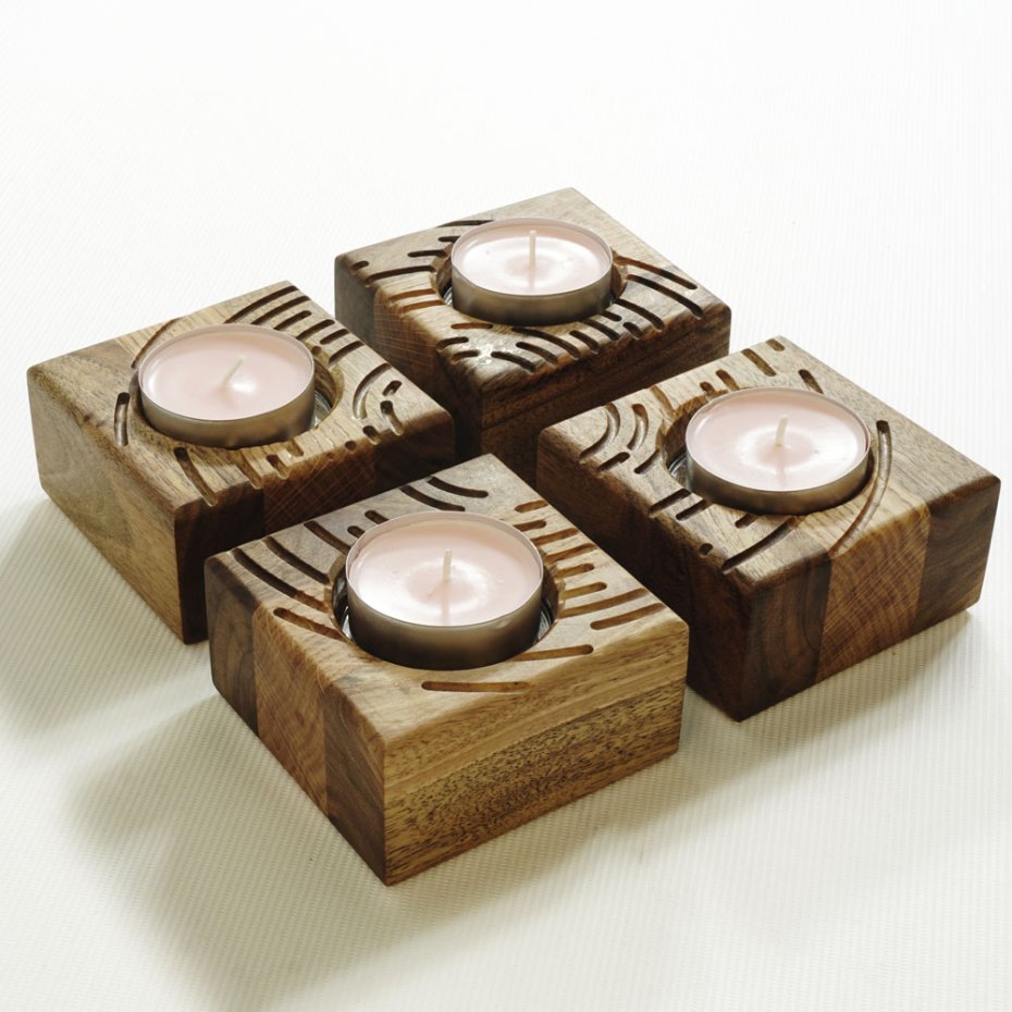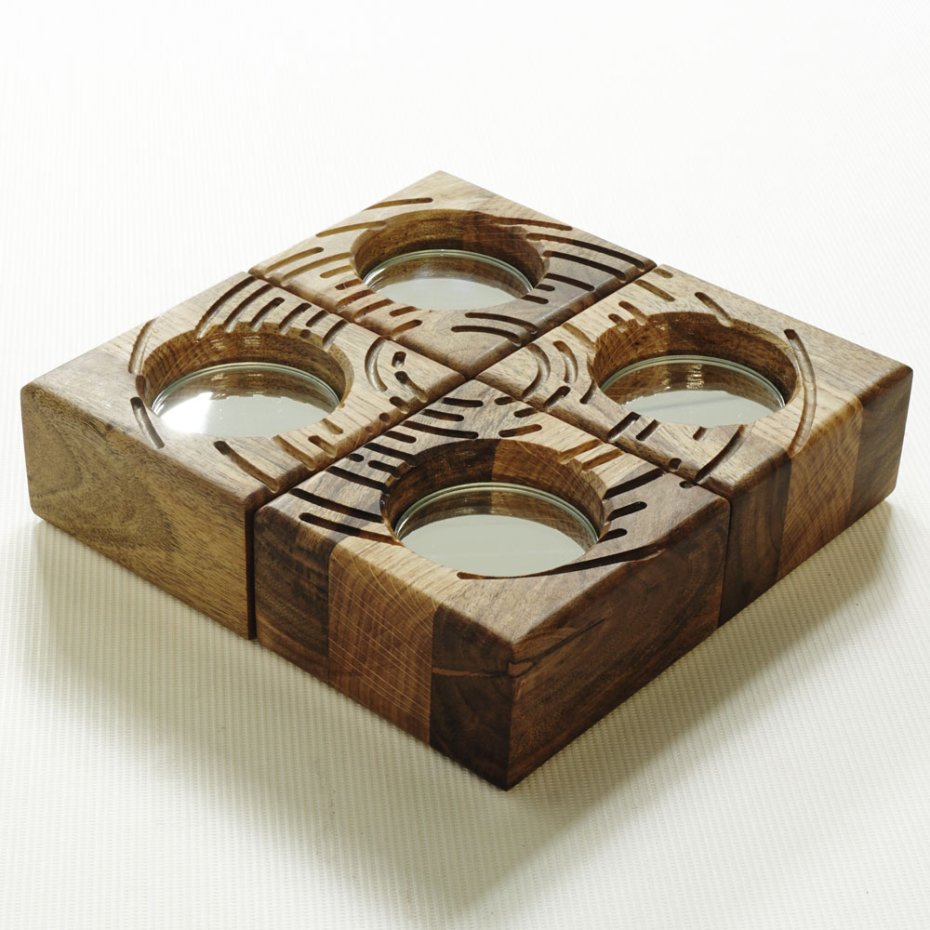 Każda bryła została wyrzeźbiona w litym drewnie. Frezowane, organiczne linie prowadzą światło w różnych kierunkach, dzięki czemu układ zmienia się w zależności od ustawienia elementów.