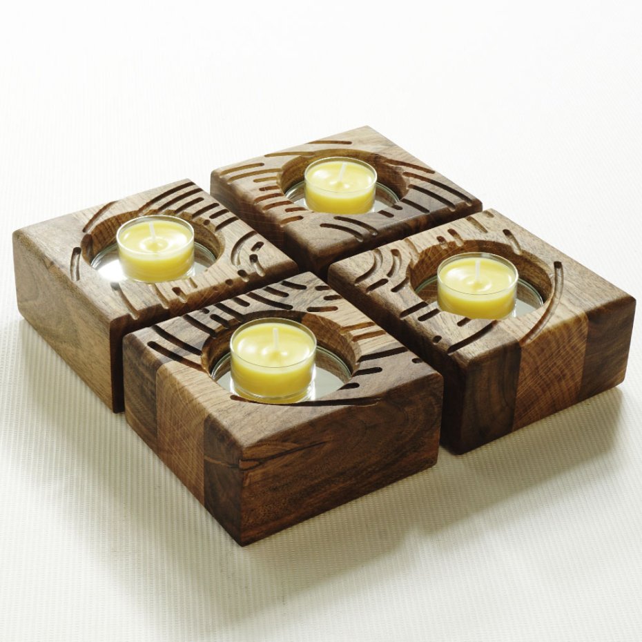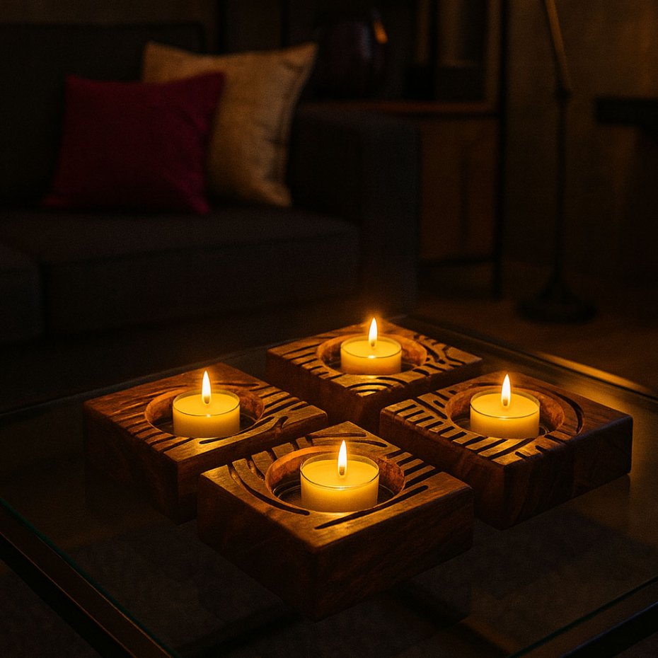 Ten zestaw czterech podstaw pod tealighty daje coś więcej niż pojedynczy punkt światła — pozwala budować układ. Możesz je zestawiać, rozsuwać, obracać. Każdy element działa samodzielnie, ale dopiero razem tworzą pełną historię.
