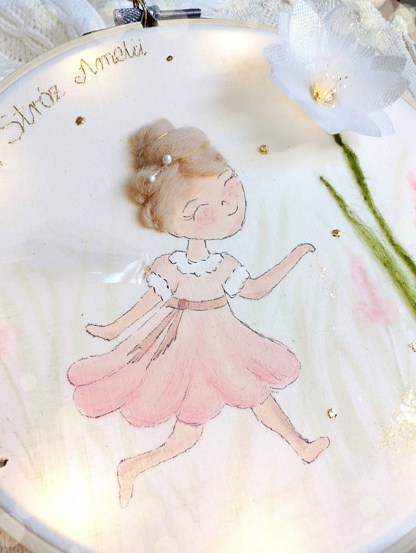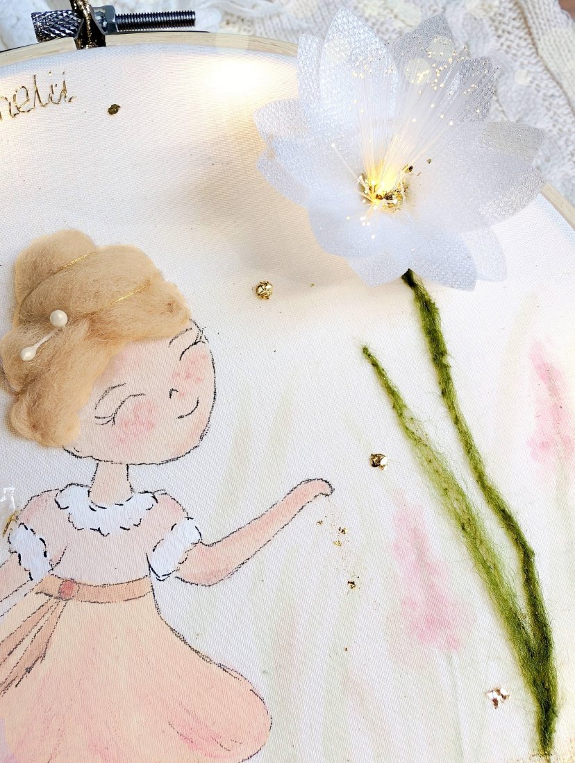 Efekt 3D tworzą włosy, skrzydełka, kwiatek i złocenia.
