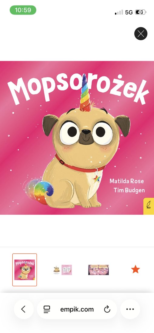 Mięciutka, ręcznie wykonana poduszka w kształcie mopsa. Piesek ma czarny pyszczek, tęczowy ogon oraz róg jednorożca, co nadaje mu bajkowy, unikatowy charakter. Idealny do przytulania i jako oryginalna dekoracja.