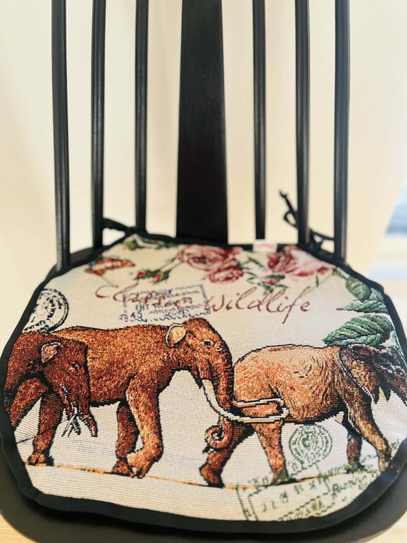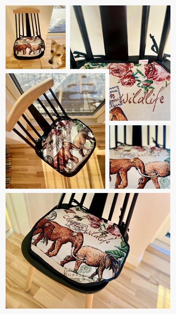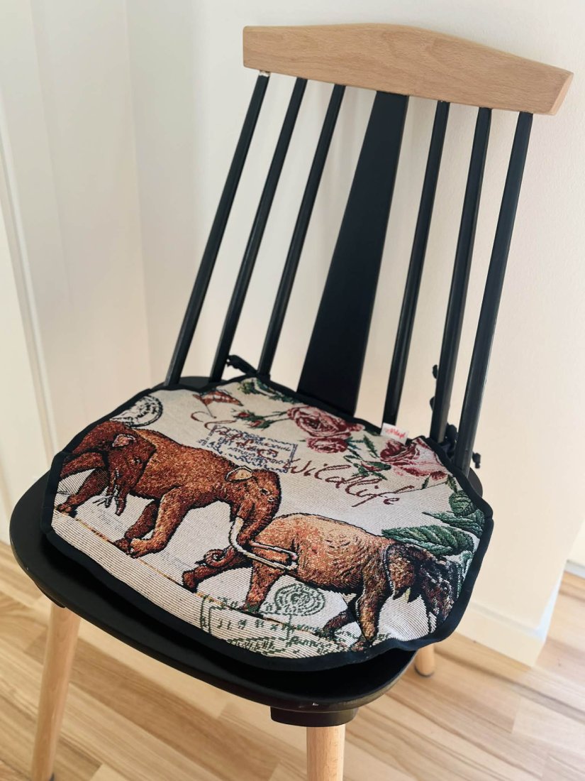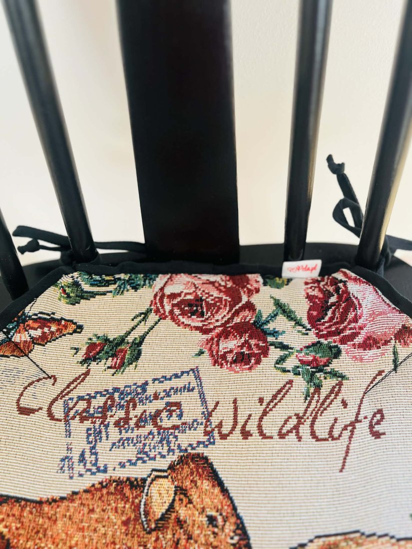 Zaprojektowana w eleganckiej czarno-beżowej kolorystyce, z motywami kwiatów i dzikiej przyrody, zamienia każde krzesło w przytulne i stylowe miejsce — idealne do kuchni, jadalni czy kącika do czytania.