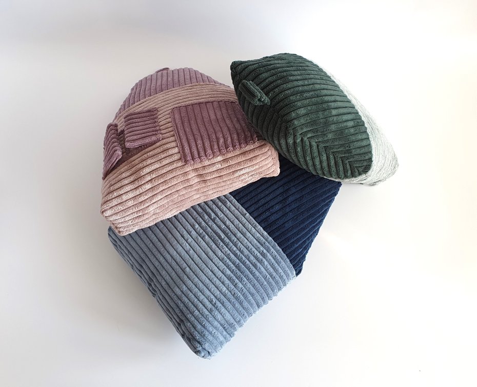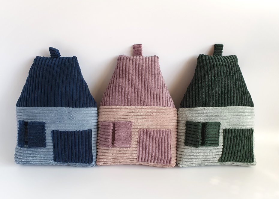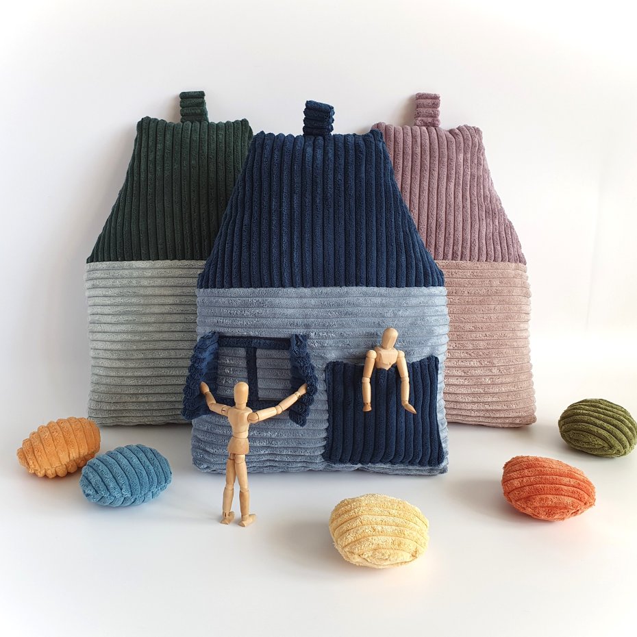 Poduszka uszyta jest ze sztruksu i wypełniona płatkami pianki, naszyte kolorowe aplikacje z tej samej tkaniny. Rozmiar poduszki to około 40 x 33 cm (+/- 1cm), głębokość w dolnej części ok. 6cm. Komin i drzwi są podszyte podszewką.