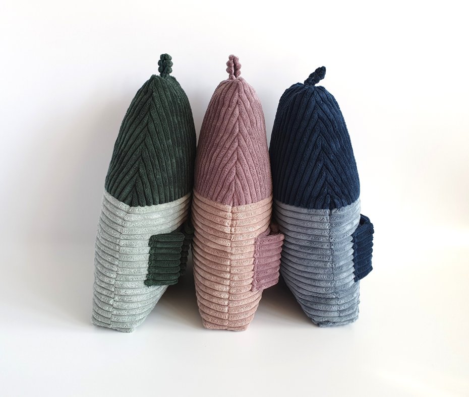 Poduszka uszyta jest ze sztruksu i wypełniona płatkami pianki, naszyte kolorowe aplikacje z tej samej tkaniny. Rozmiar poduszki to około 40 x 33 cm (+/- 1cm), głębokość w dolnej części ok. 6cm. Komin i drzwi są podszyte podszewką.