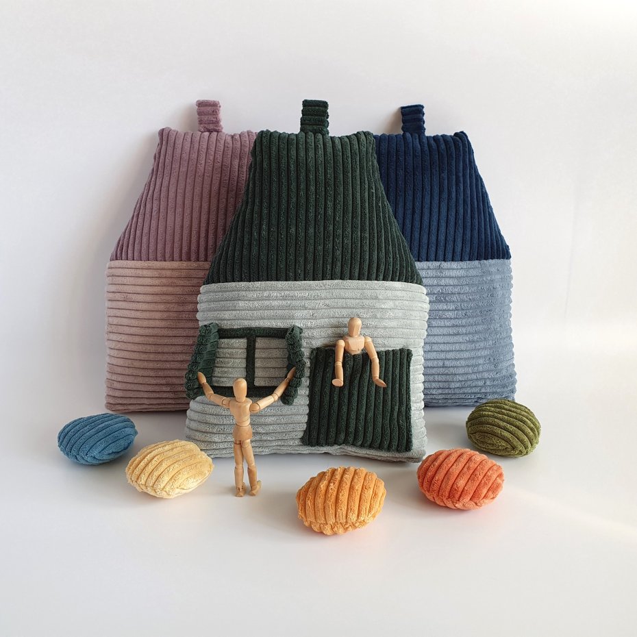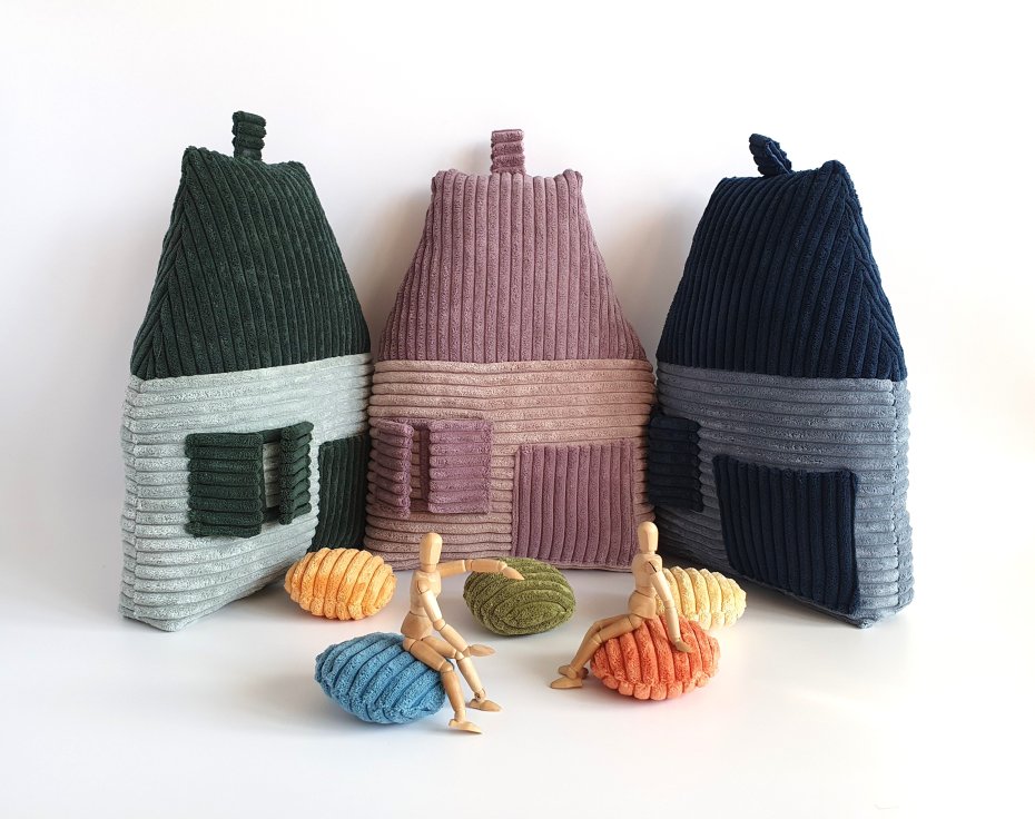Poduszka uszyta jest ze sztruksu i wypełniona płatkami pianki, naszyte kolorowe aplikacje z tej samej tkaniny. Rozmiar poduszki to około 40 x 33 cm (+/- 1cm), głębokość w dolnej części ok. 6cm. Komin i drzwi są podszyte podszewką.