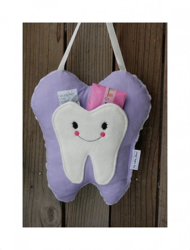 Wisząca poduszeczka z kieszonką na drobne upominki, które przynosi wróżka Zębuszka za wypadnięte mleczne zęby schowane pod poduszką. Gdy maluchowi wypadanie ząb, nocą do kieszonki możemy wsunąć drobny upominek, słodycze czy pieniądze. Rano radość będzie wielka :). Poduszkę można zawiesić na łóżku, na ścianie czy na klamce od drzwi.