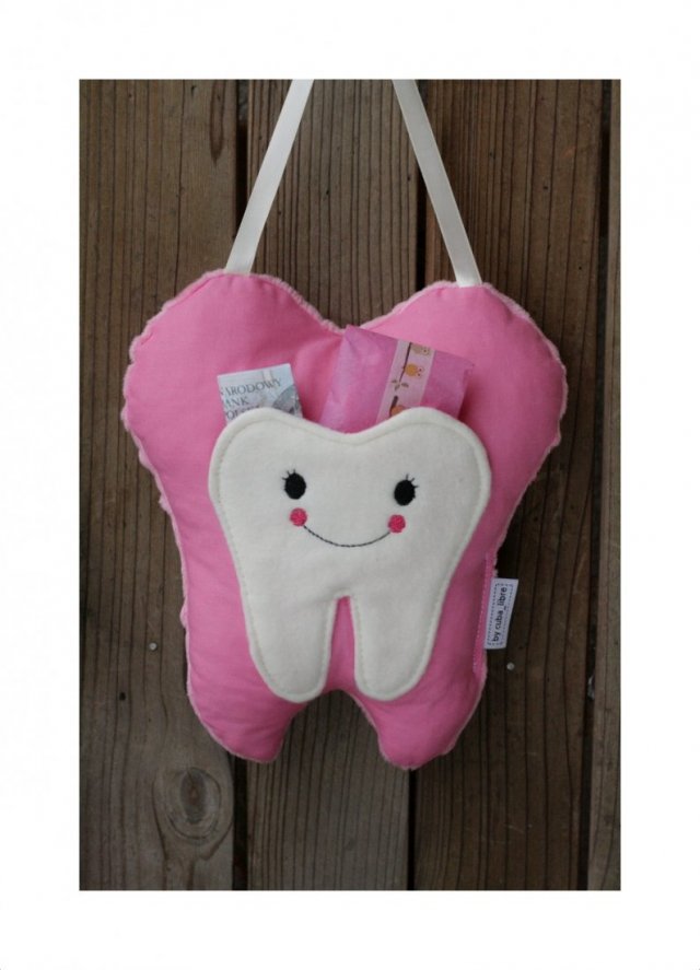 Wisząca poduszeczka z kieszonką na drobne upominki, które przynosi wróżka Zębuszka za wypadnięte mleczne zęby schowane pod poduszką. Gdy maluchowi wypadanie ząb, nocą do kieszonki możemy wsunąć drobny upominek, słodycze czy pieniądze. Rano radość będzie wielka :). Poduszkę można zawiesić na łóżku, na ścianie czy na klamce od drzwi.