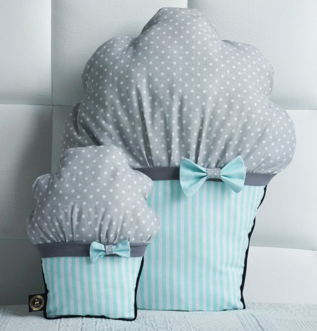 Przedmiotem sprzedaży są słodkie pastelowe podusie. Jest to zestaw dwóch dekoracyjnych poduszek w kształcie mufinek, w odcieniach szarości i mięty. Komplet tych cukierkowych poduszek każdemu wnętrzu doda niezwykłego charakteru. Idealne do pokoju dziecinnego chłopca i dziewczynki. Wiele moich projektów poduszek, stanowi część całej kolekcji, dając tym samym możliwość kreatywnego skompletowania pasujących zestawów kolorystycznych. Warto podkreślić, że dzięki dodatkom i poduszkom możesz w prosty i ciekawy sposób zmienić i ożywić wygląd pokoju. Poduszki uszyte bardzo starannie z wysokogatunkowej i wytrzymałej 100% bawełny. Elegancka wypustka podkreśla krawędzie poszewki. Poduszka wypełniona anty-alergicznym sprężystym wkładem, idealnie dopasowanym do rozmiaru poszewki. Rozmiar: 40cm x 45cm oraz 25x20cm. Czas realizacji zamówienia 4 dni. Czas realizacji zamówienia 4 dni.