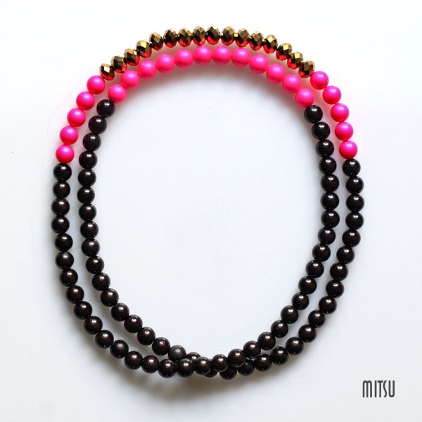 Nowoczesny, modny, odważny naszyjnik. Wykonany z neonowej perły Swarovskiego, akrylowych czarnych korali odbijających światło, oraz złotych kryształków typu rondelle. Naszyjnik można nosić w wersji długiej, jak również podwójnej. Można go układać symetrycznie, asymetrycznie, generalnie można z nim popracować wg potrzeb :) Dostępne są dwie długości: dla cieniutkich szyj 82cm i dla tych Pań które wolą mieć dłuższą wersję 92 cm. Naszyjnik przybędzie ładnie zapakowany.