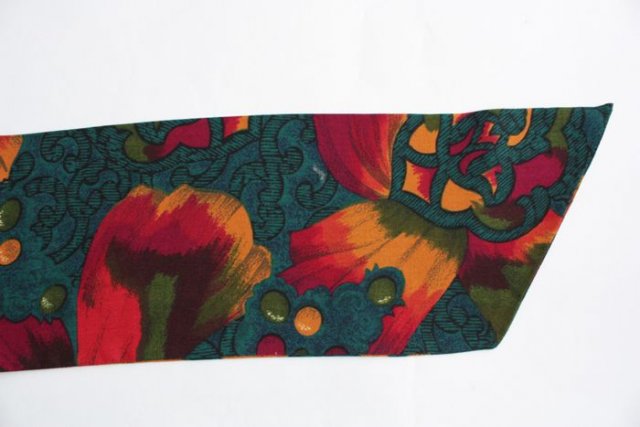 Szal w piękne wzory, o skośnych brzegach. Wykonany z podwójnie zszytego materiału.