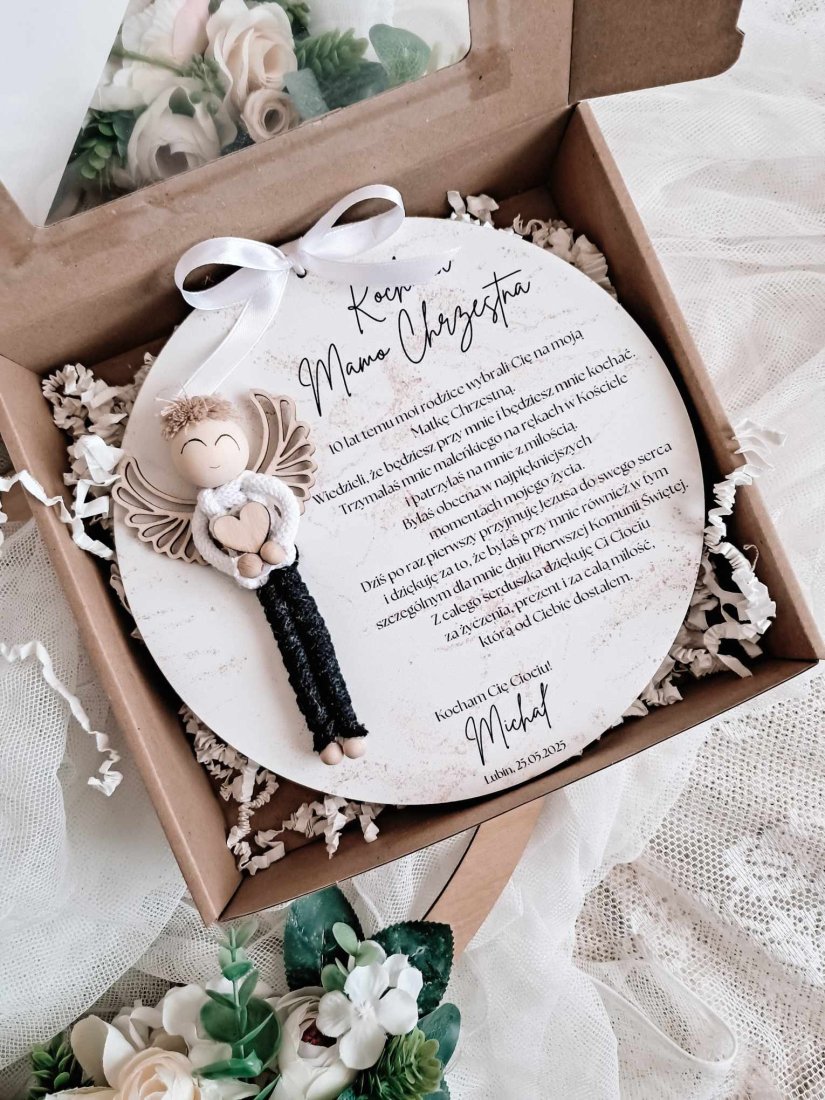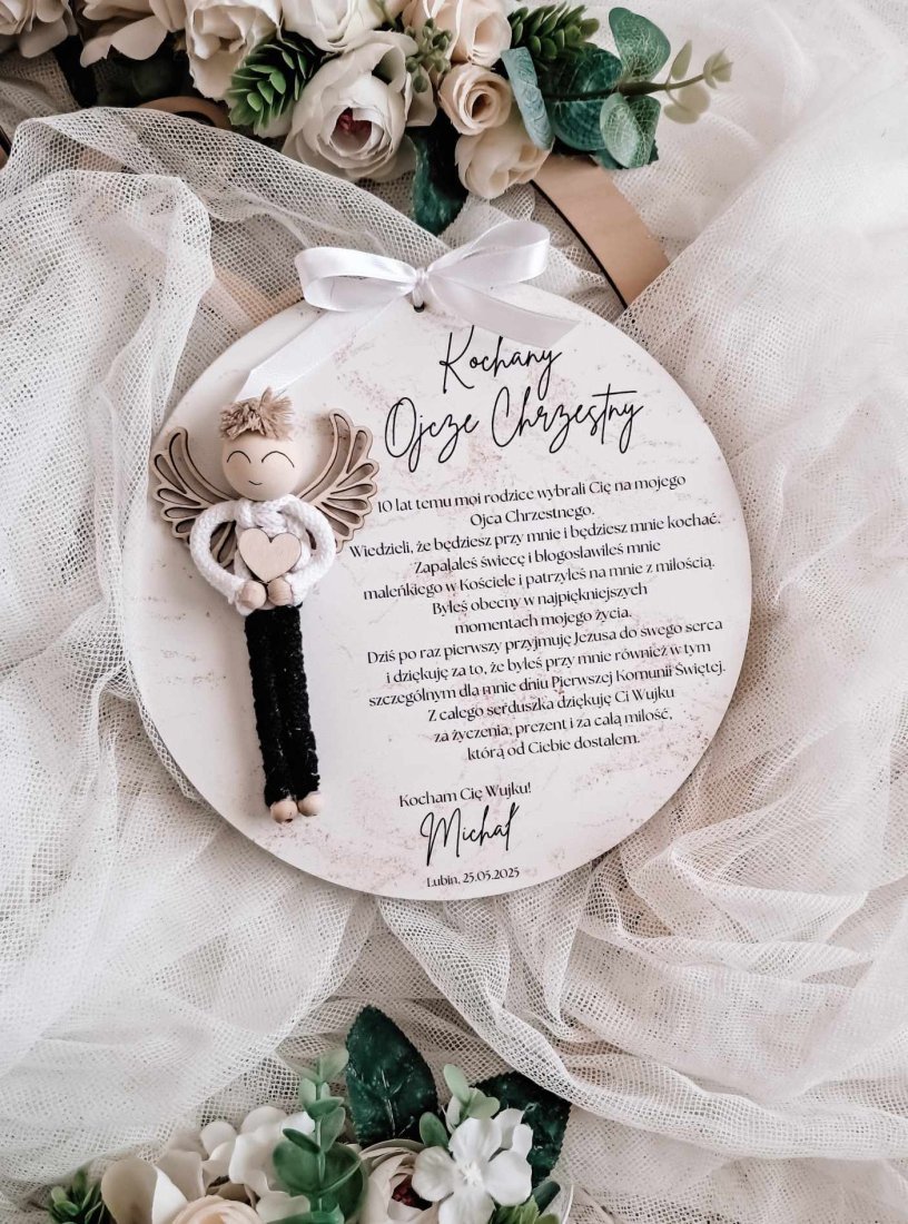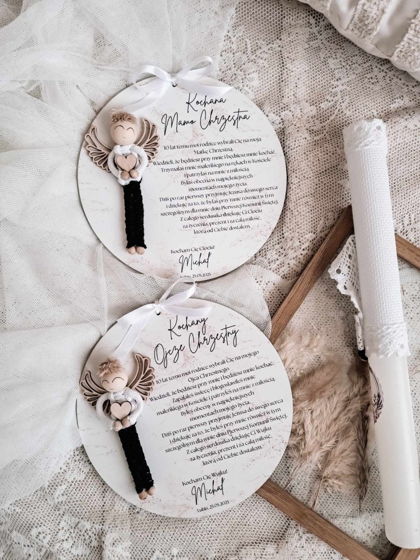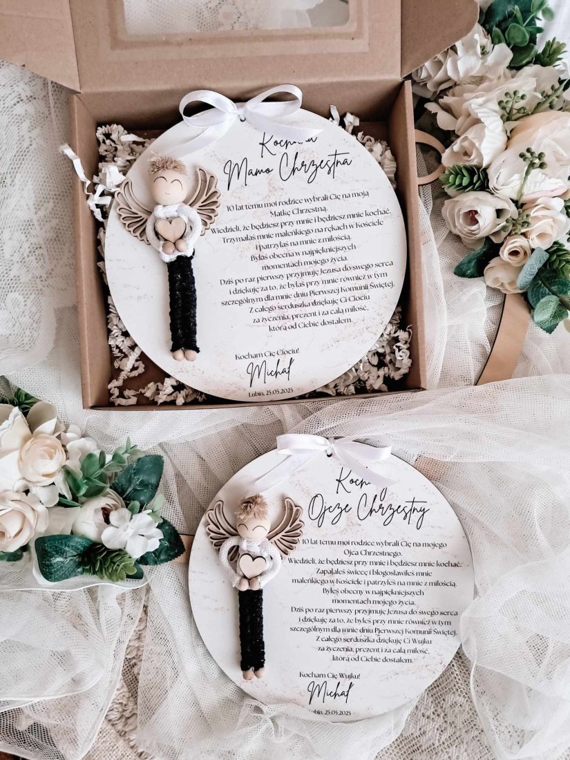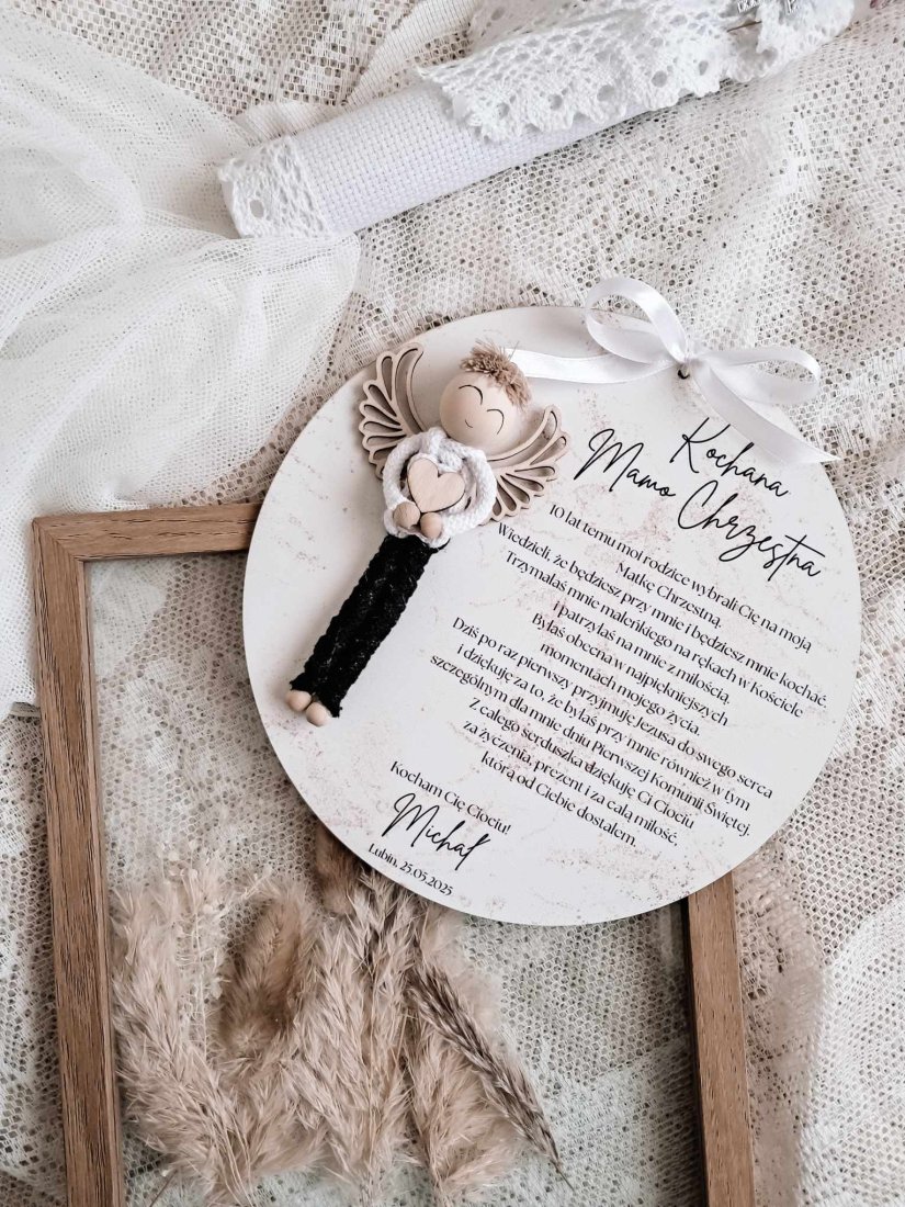 Każde podziękowanie wykonane jest w formie eleganckiej tabliczki o średnicy 20cm, ozdobionej uroczą figurką ręcznie plecionego aniołka oraz pięknie zaprojektowanym tekstem, wyrażającym wdzięczność i miłość od serca. Personalizacja pozwala na dodanie imienia dziecka oraz daty uroczystości, dzięki czemu prezent staje się jeszcze bardziej unikatowy.