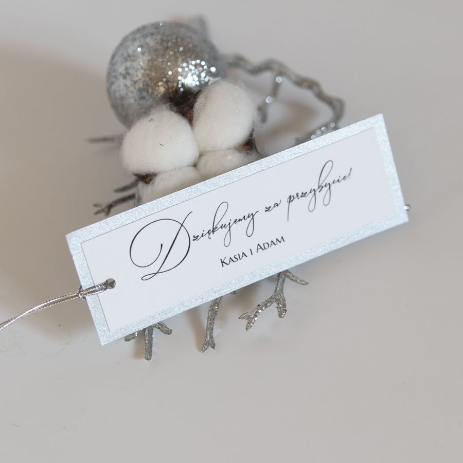 Takie zawieszki idealnie wpiszą się w klimat ślubu i wesela zimową porą:) Nie tylko elegancko ozdobią podarunki z podziękowaniem dla gości, ale jednocześnie będą subtelną dekoracją stołu weselnego. Zawieszkę możesz doczepić do torebki ze słodkościami, magnesu, świeczki, mini miodku, czy innego podziękowania, które przewidzieliście na swoim przyjęciu. W tej samej kolkcji dopasuję dla Was inne dodatki ślubne np. zawieszki na butelki, winietki, menu czy numery stolików.
