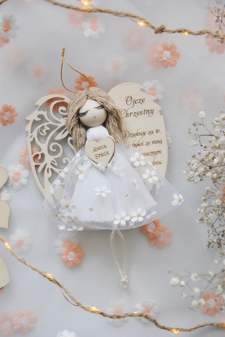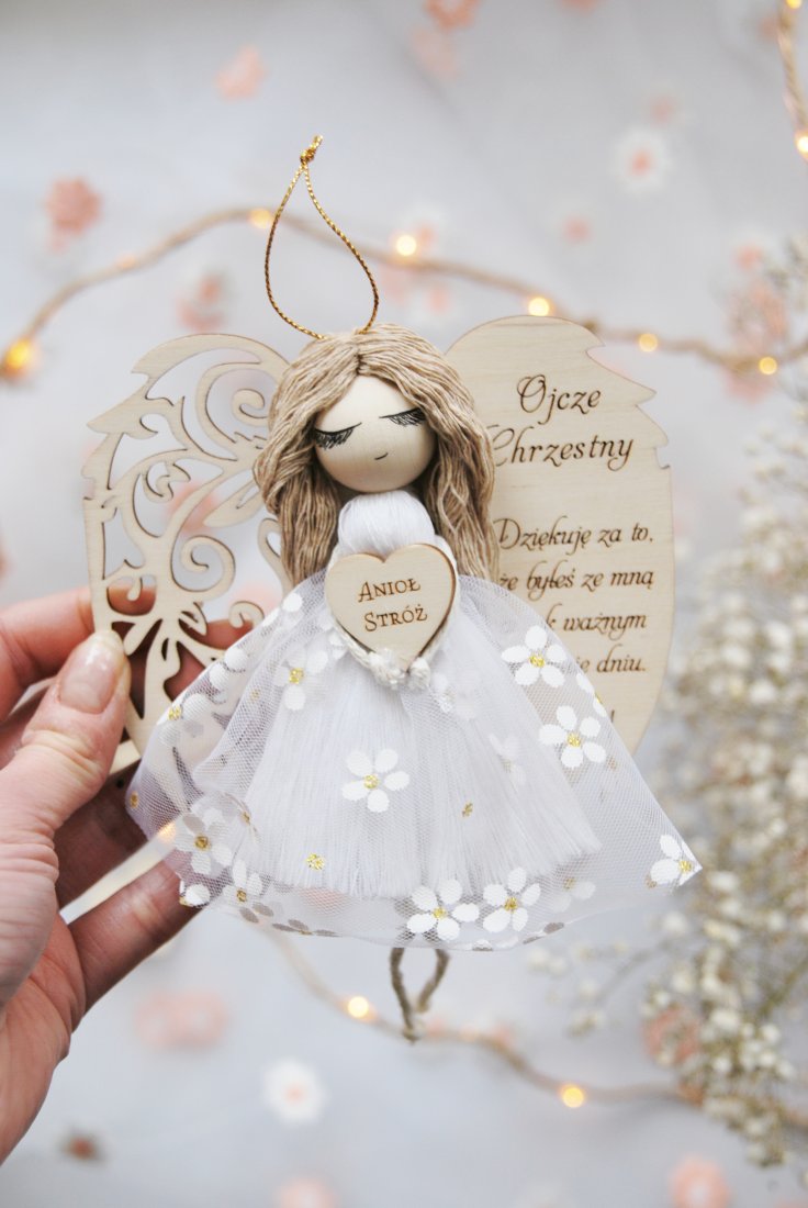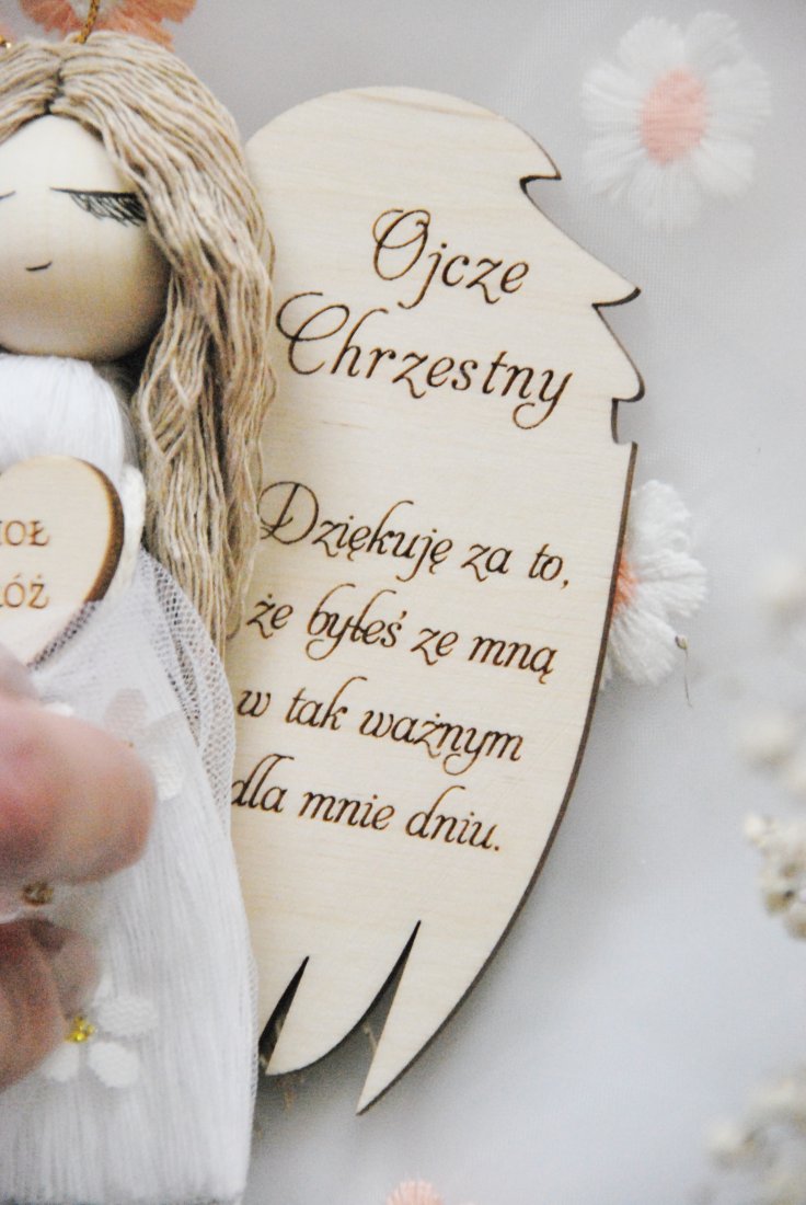 Wyjątkowe i pełne symboliki podziękowanie dla Chrzestnego Ojca, który towarzyszy dziecku w najważniejszych dniach jego życia. Ręcznie wykonany aniołek z dedykacją to prezent niosący ze sobą wdzięczność, ciepło i duchowe znaczenie.