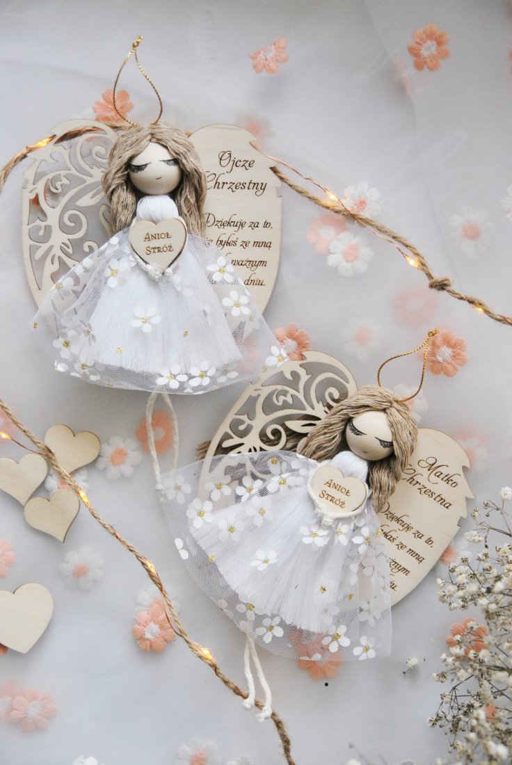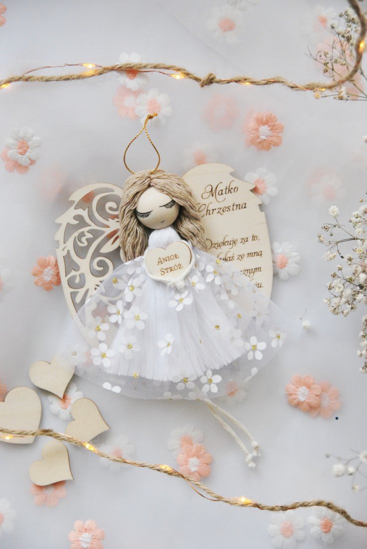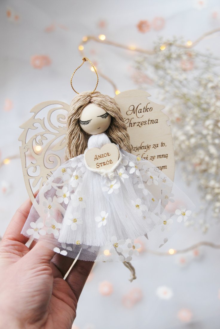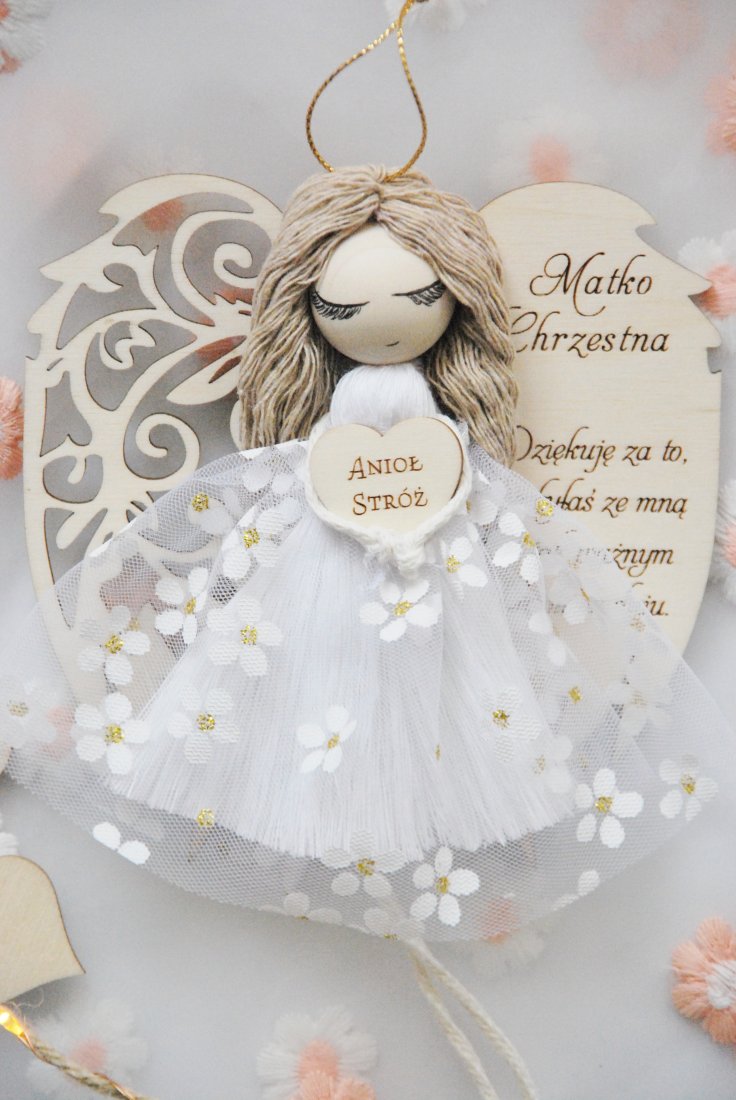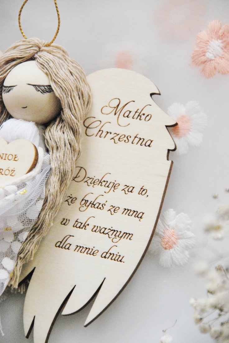 Wyjątkowe i pełne symboliki podziękowanie dla Chrzestnej Matki, która towarzyszy dziecku w najważniejszych dniach jego życia. Ręcznie wykonany aniołek z dedykacją to prezent niosący ze sobą wdzięczność, ciepło i duchowe znaczenie.