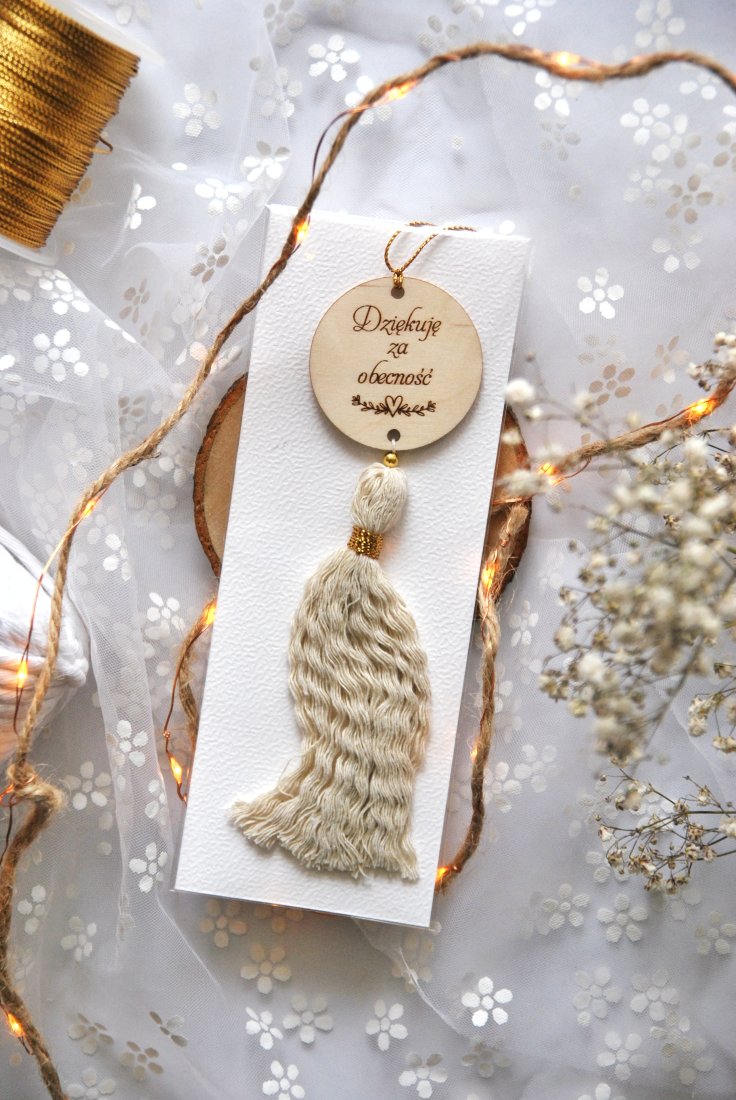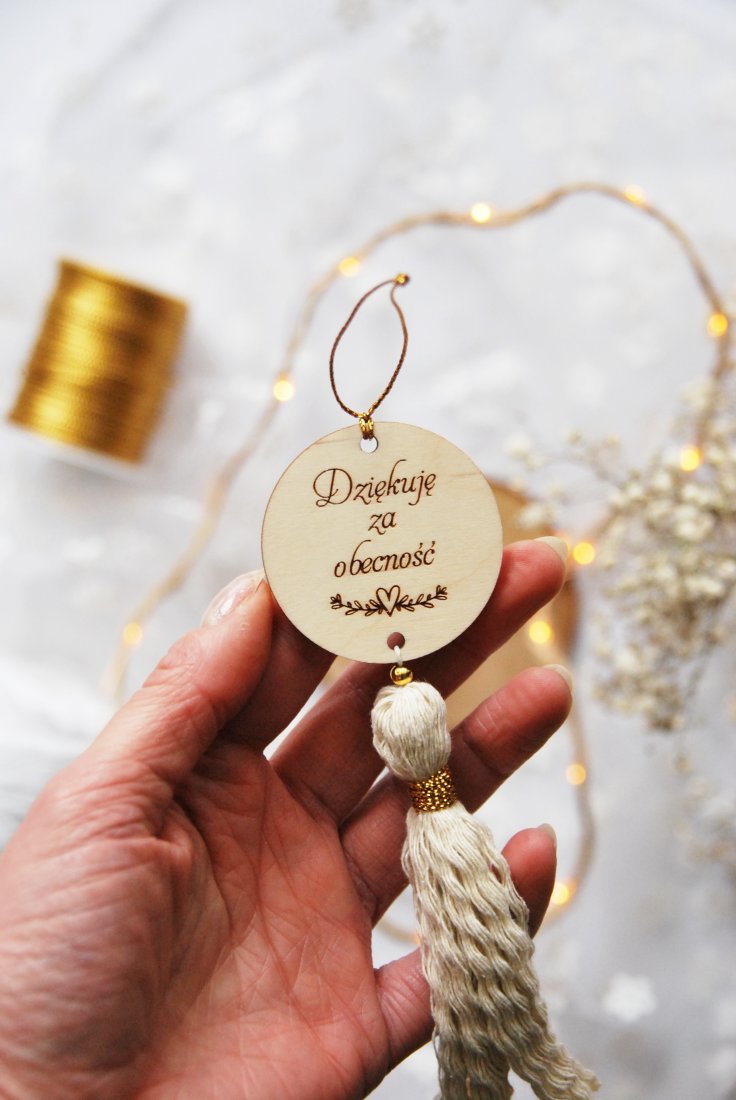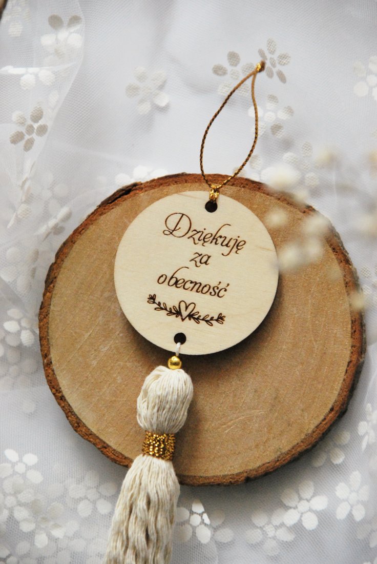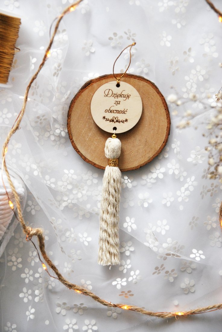 Okrągła zawieszka wykonana z drewna, ozdobiona grawerem "Dziękuję za obecność", została uzupełniona eleganckim, jasnym chwostem w stylu boho. Całość prezentuje się lekko, ciepło i bardzo estetycznie – idealnie pasuje do uroczystości w stylu klasycznym, rustykalnym lub naturalnym.