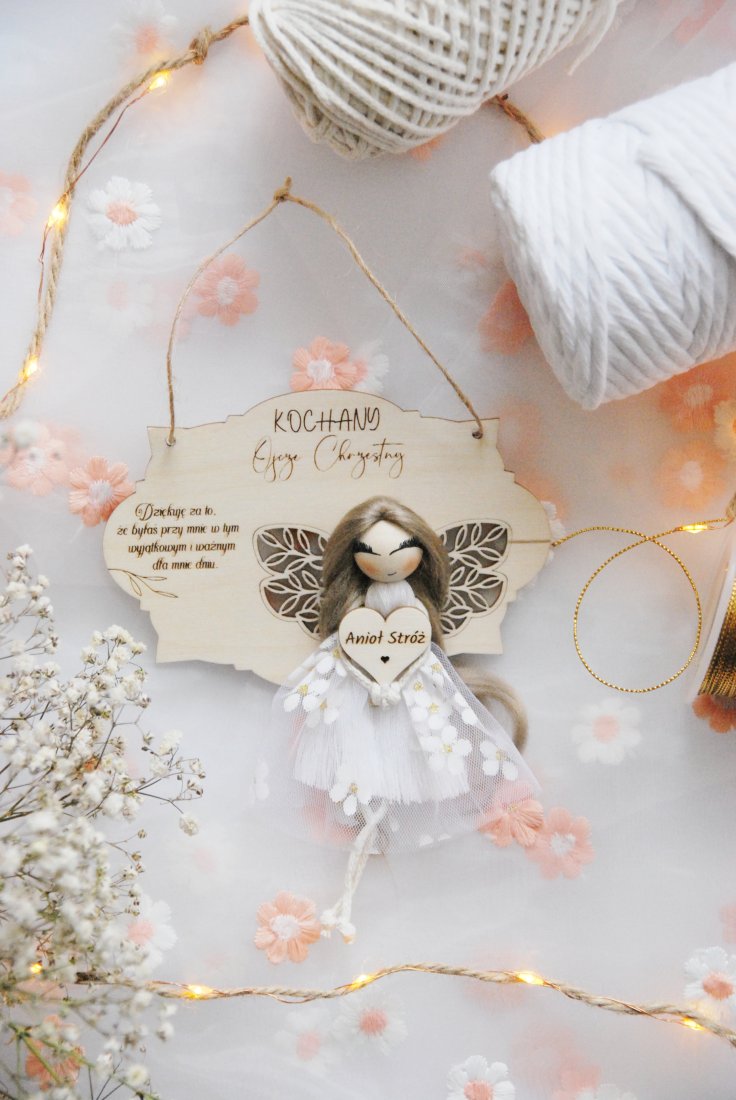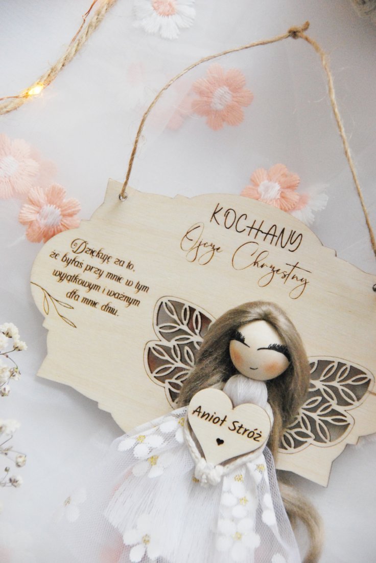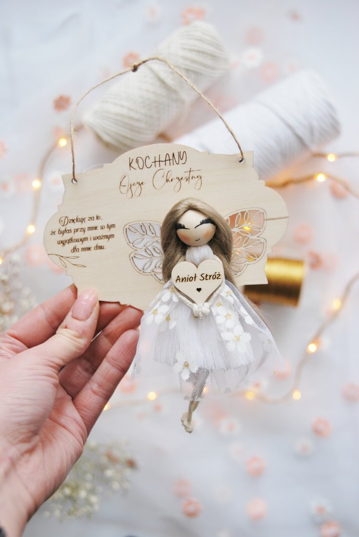 Delikatny aniołek z subtelnymi skrzydłami, tiulową sukienką i napisem symbolizuje opiekę, dobro i bliskość. Drewniana tabliczka z dedykacją sprawia, że prezent nabiera osobistego charakteru i staje się pięknym wyrazem wdzięczności za obecność w tak ważnym dniu, jak chrzest święty lub pierwsza komunia.