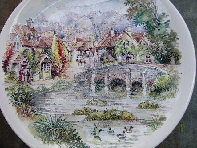 Ciekawy i ozdobny Talerz ceramiczny sygnowany POOLE ENGLAND. Solidny bardzo ciekawie zdobiony. Użytkowy,choć tu z uchwytem do powieszenie,bo uroczym obrazkiem - szczególnie w kolekcji być może. N tle w kolorze ecru sielska scenka w delikatnych barwach - tło błyszczące - zdobienie satynowe.
