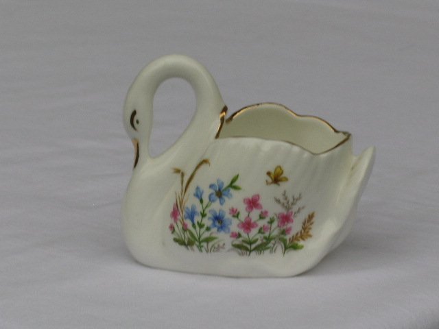 Porcelanowa łabędzia forma, kwiatowo zdobna, doskonała do łazienki, dekoracyjna, w angielskim stylu. Sygnowana, na błyszcząco szkliwiona. Złocenie. 8 x 5 x niecałe 7 cm. Stan zachowania bardzo dobry.