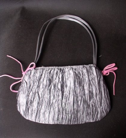 Mała,wieczorowa torebka-NOWA.Uszyta ze srebrnego ,pogniecionego materiału.Zapinana na różowy zamek.Podszewka różowa.Po bokach paseczki z różowej skórki,wiązane na kokardkę.Dość sztywne dwie rączki.Stan bardzo dobry.Wysokość 14 cm.szerokość 22 cm.