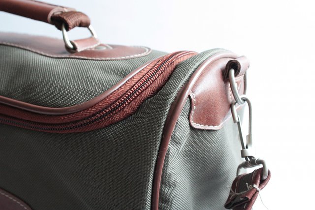 Oryginalna, pojemna torba w kolorze zgaszonej zieleni. Wykonana z mocnej tkaniny i (prawdopodobnie) skóry ekologicznej). Stan bardzo dobry. Pasek jest odpinany. Można regulować jego długość.