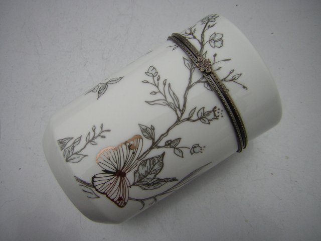 Pięknie zdobiony i szlachetnie wykonany pojemnik. Na herbatę, przyprawy....Dość spory, szlachetnie wykonany, choć nie sygnowany. Mocna, dźwięczna ceramika wewnątrz i z zewnątrz na satynowo - błyszcząco wykończona. Dół przykrywki i góra pojemnika okute metalem, zawiasik i zameczek. Zdobienie srebrzysto - platynowe, szczypty złota i rozbielone go błękitu. Bardzo elegancki i kobiecy. Góra 7,5 dół 6 cm wys. Z przykrywką około 12 cm, bez 9 cm otwór trochę ponad 6,5 cm