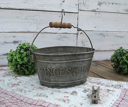 Piękny metalowy pojemnik na klamerki do prania, ozdobiony napisem pinces a linges co oznacza - klamerki do bielizny, posiada haczyk do zawieszenie pojemnika na sznurku.
