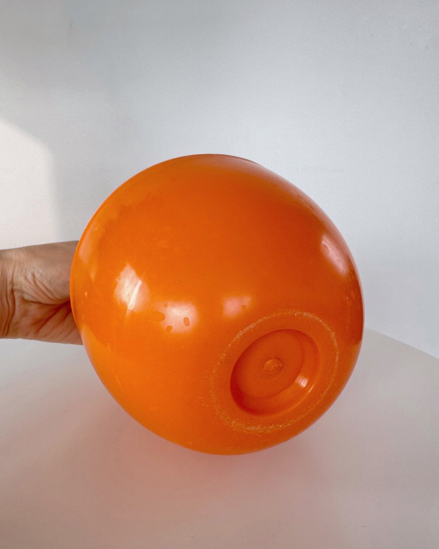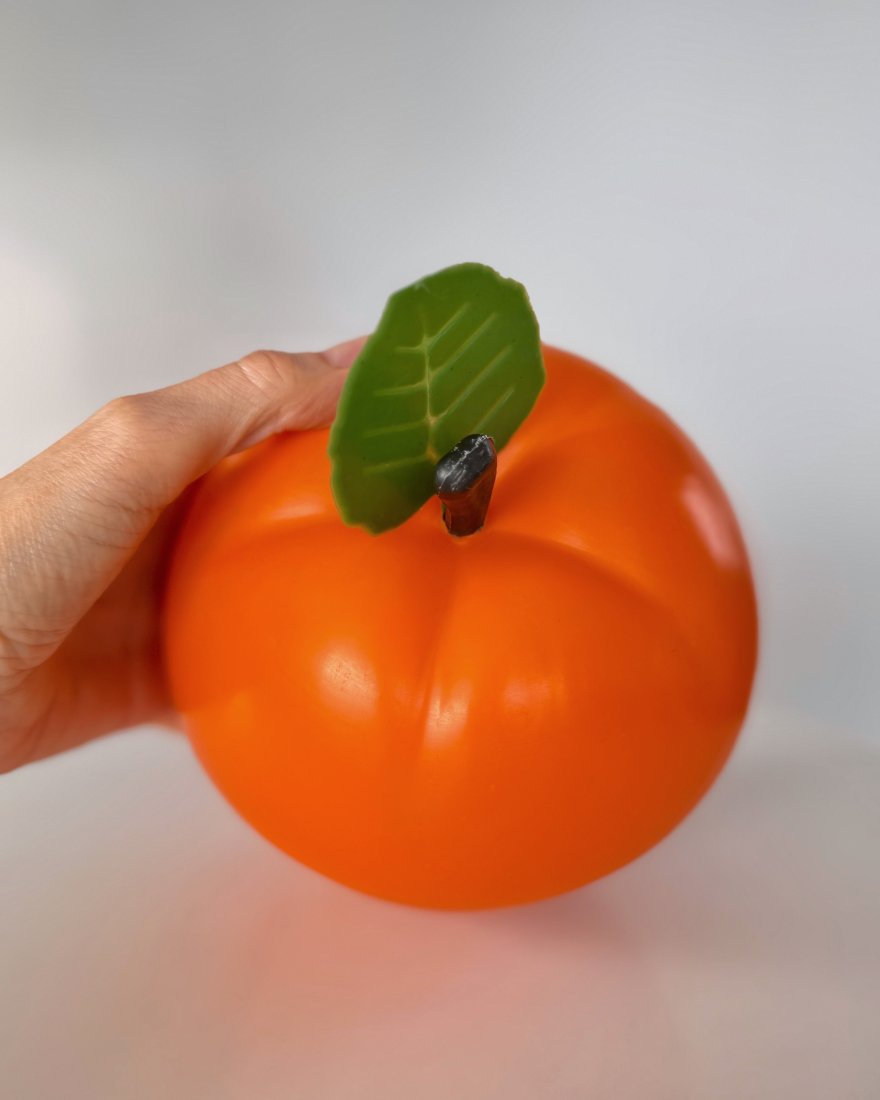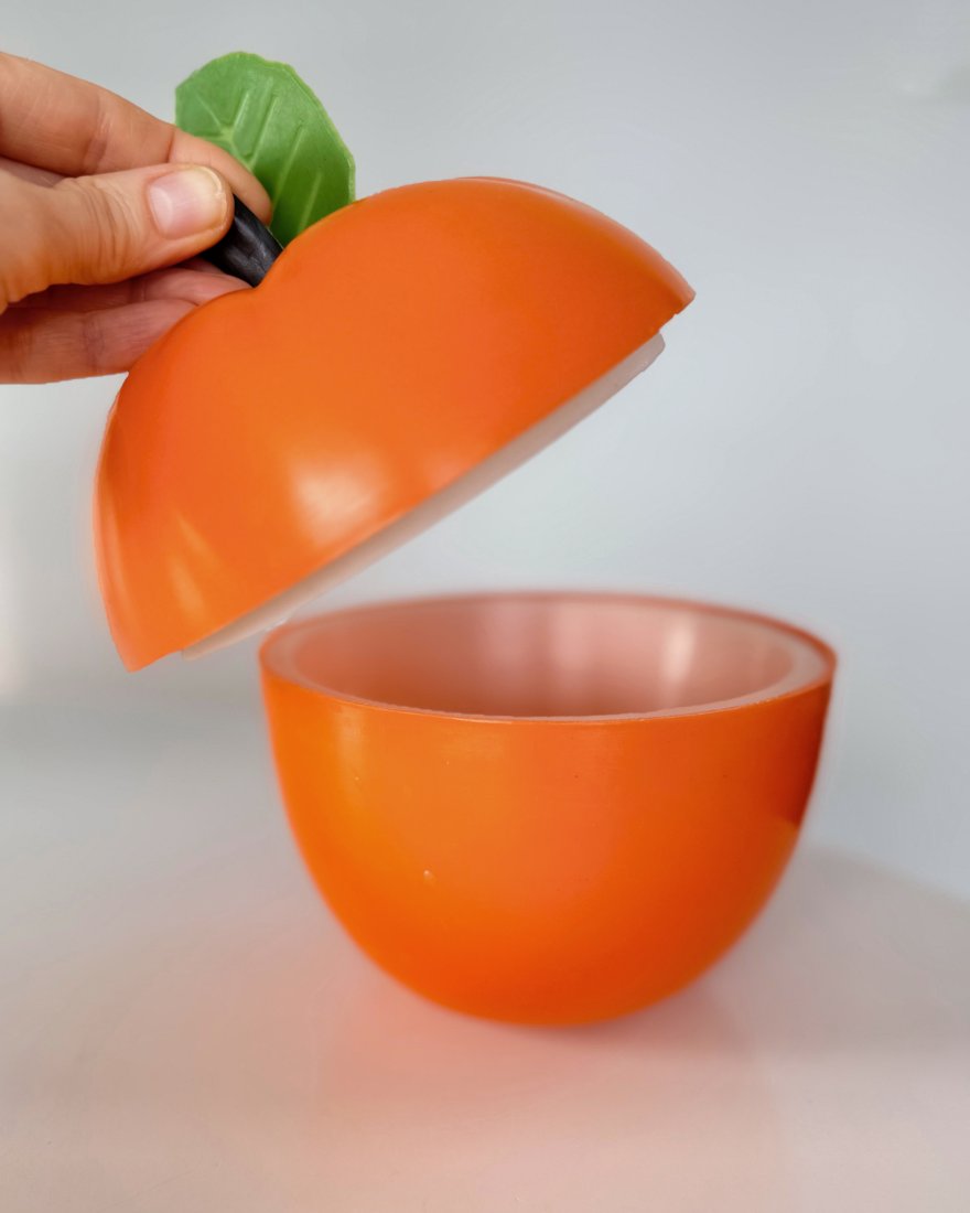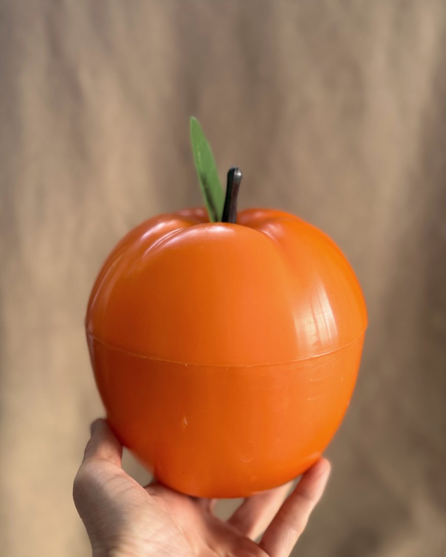 Pojemnik w kształcie jabłka, wykonany z tworzywa sztucznego z przeznaczeniem na lód.
