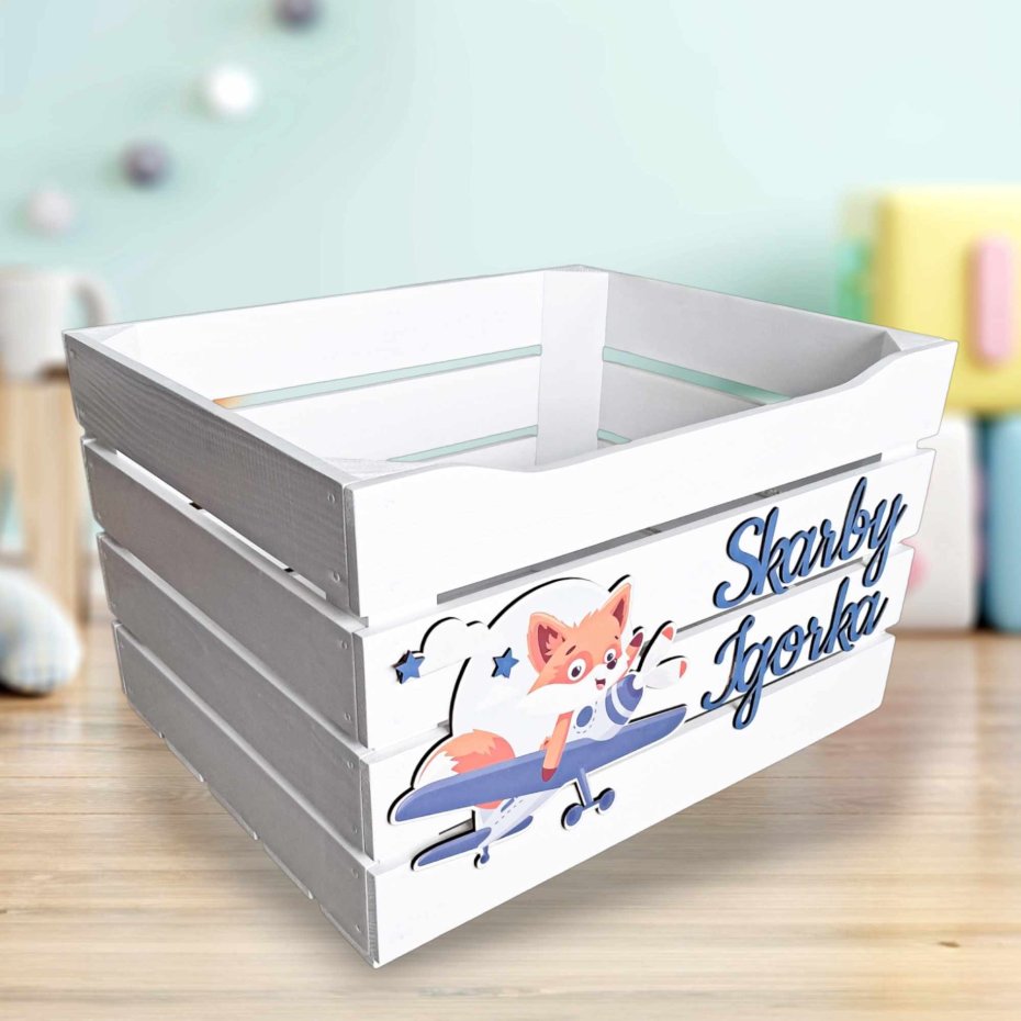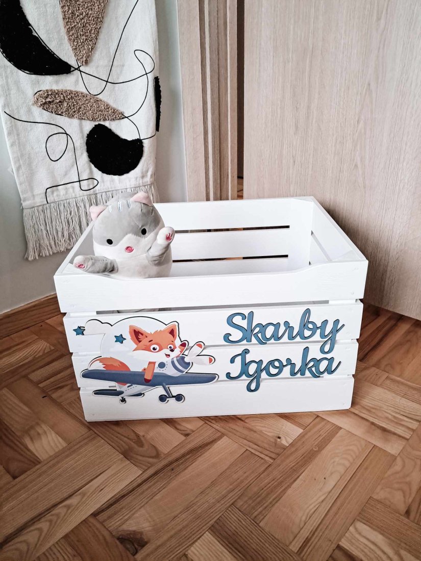 Skrzynia z pięknym dekorem liska w samolocie drewnianego imienia na froncie sprawia, że to nie zwykła skrzynia;)