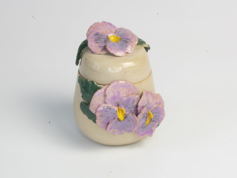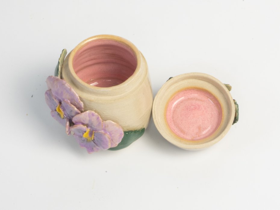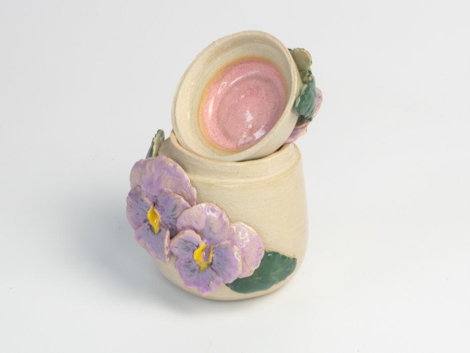 Mały pojemnik został wykonany ręcznie: bazę uformowano na kole garncarskim, a następnie ozdobiono ją delikatnymi, trójwymiarowymi kwiatami bratków i zielonymi listkami. Wnętrze pojemnika oraz spód pokrywki wykończono różowym szkliwem, które tworzy subtelny, ciepły akcent, idealnie komponujący się z kremową barwą gliny i pastelowym fioletem dekoracyjnych bratków. Zewnętrzną powierzchnię zabezpieczono przezroczystym szkliwem, które eksponuje strukturę oraz naturalność wyrobu. Pojemnik jest niepowtarzalny, inspirowany naturą i świetnie sprawdzi się do przechowywania biżuterii czy drobiazgów oraz jako wyjątkowy, ręcznie wykonany prezent.