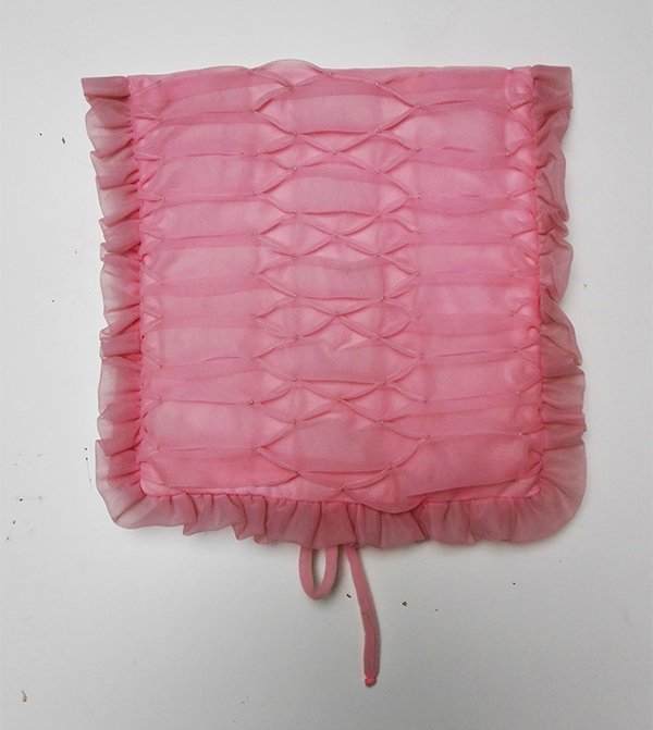 Pojemnik, torebeczka retro uszyta z różowego tiulu. Z przodu misternie-pięknie marszczona. Wew.kieszeń, na końcach wiązania. Pojemnik na bieliznę lub inne.