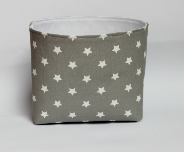 Pojemnik na dziecięce akcesoria. Może być wykorzystany jako schowek na zabawki, grzechotki czy gryzaki, ale także na pieluchy, skarpetki czy inne przedmioty. Uszyty z pięknej,szarej bawełny w białe gwiazdki.Środek biały.Usztywniony flizeliną, można go stabilnie postawić. Całość utrzymana w dziecięcej i radosnej tonacji. Idealny jako prezent dla maluszka ,a także dla mamy i taty :) Wymiary : 21,5x16cm, szer.dna 10cm (+/- 2cm) Zapraszam !