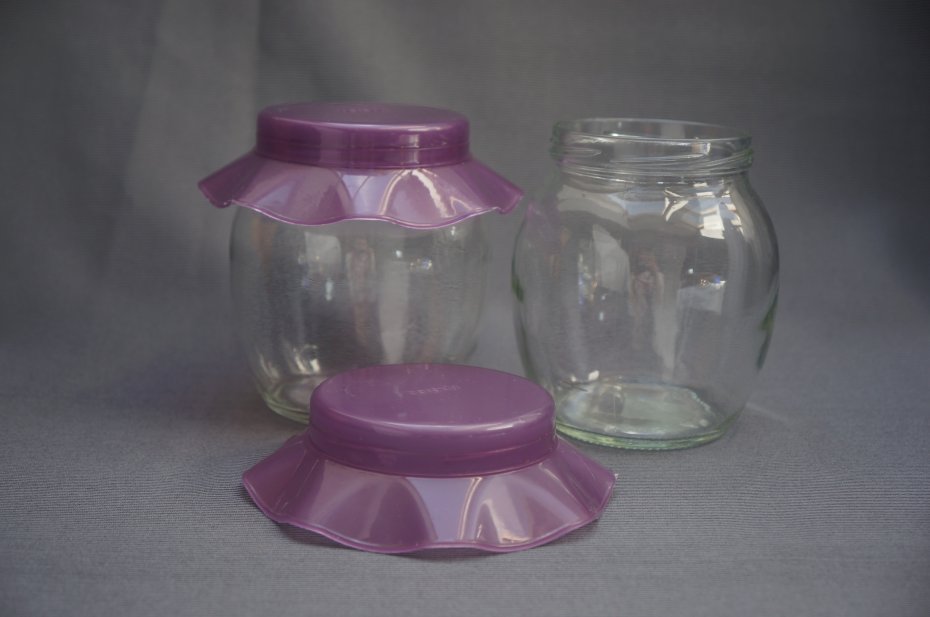 Komplet (2 sztuki) szklanych pojemników. Marka Herevin. Plastikowe zakrętki w kolorze wrzosu . Stan bardzo dobry.