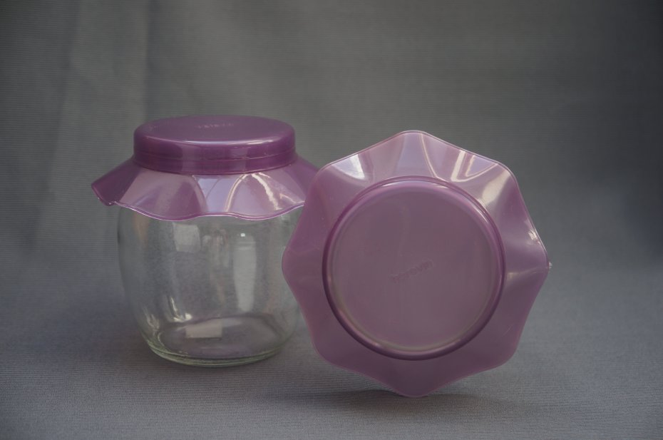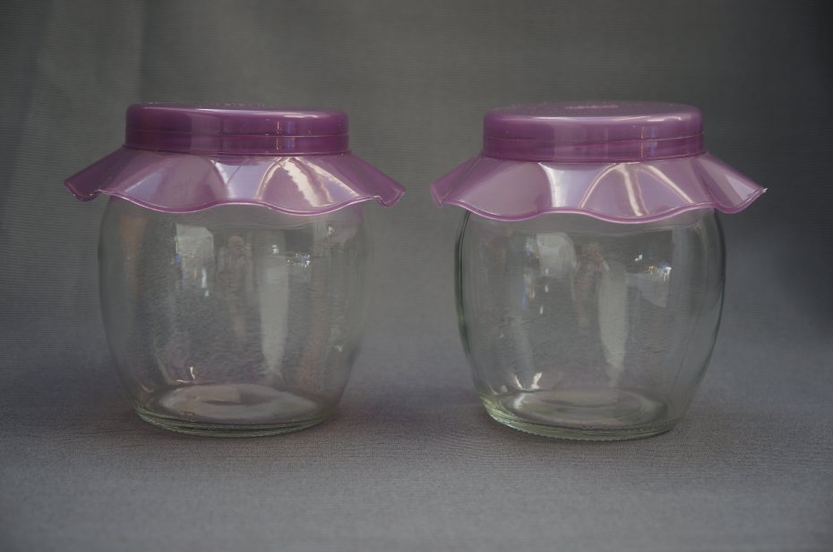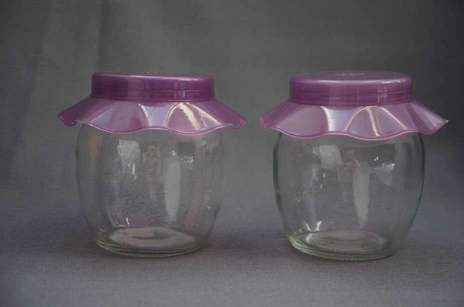 Komplet (2 sztuki) szklanych pojemników. Marka Herevin. Plastikowe zakrętki w kolorze wrzosu . Stan bardzo dobry.