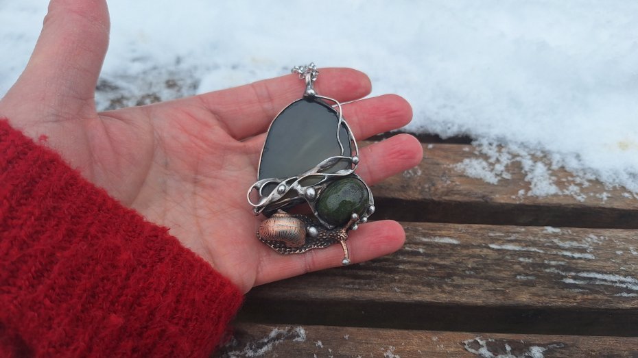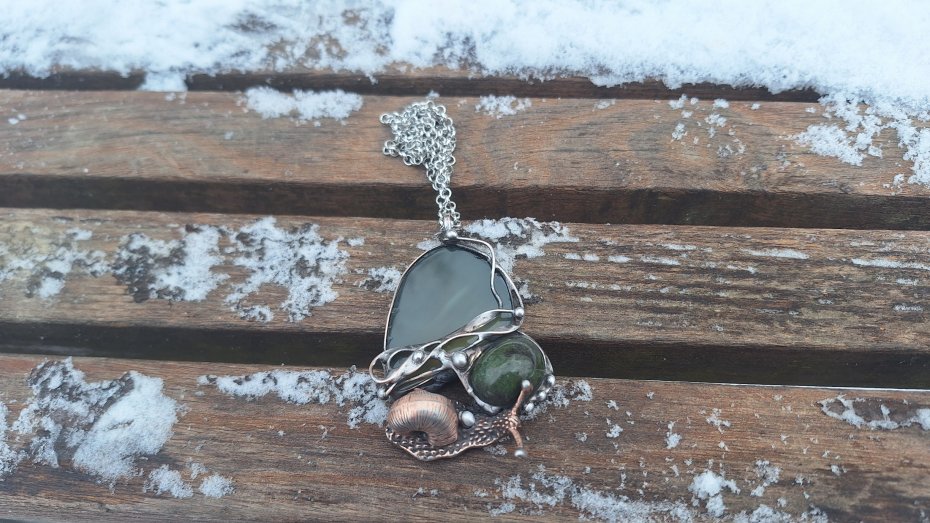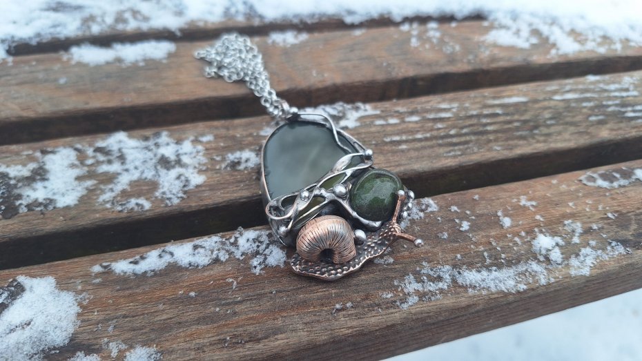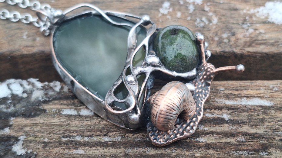 Wisiorek wykonany z miedzi, cyny, jaspisu i agatu. Wymiary ok. 6 na 4 cm. Zawieszony na łańcuszku o długości ok. 50 cm.