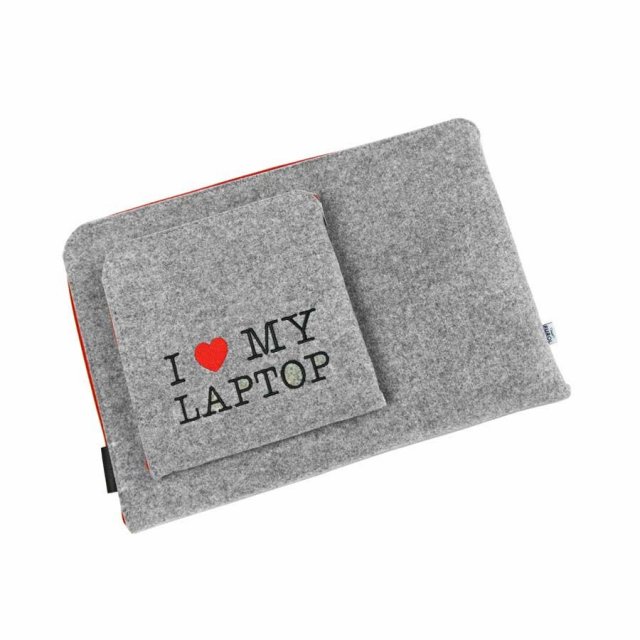 Pokrowiec z wyhaftowanym 'I love my laptop'.